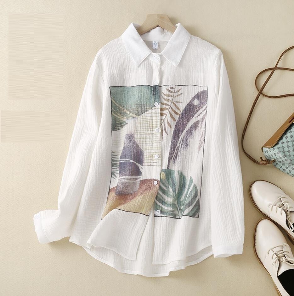 シャツ ブラウス レディース 長袖 花柄 通勤 ゆったり お洒落 綿麻 リネン プリント柄 トップス ★Mサイズ