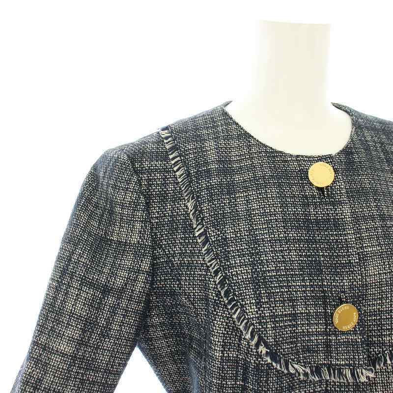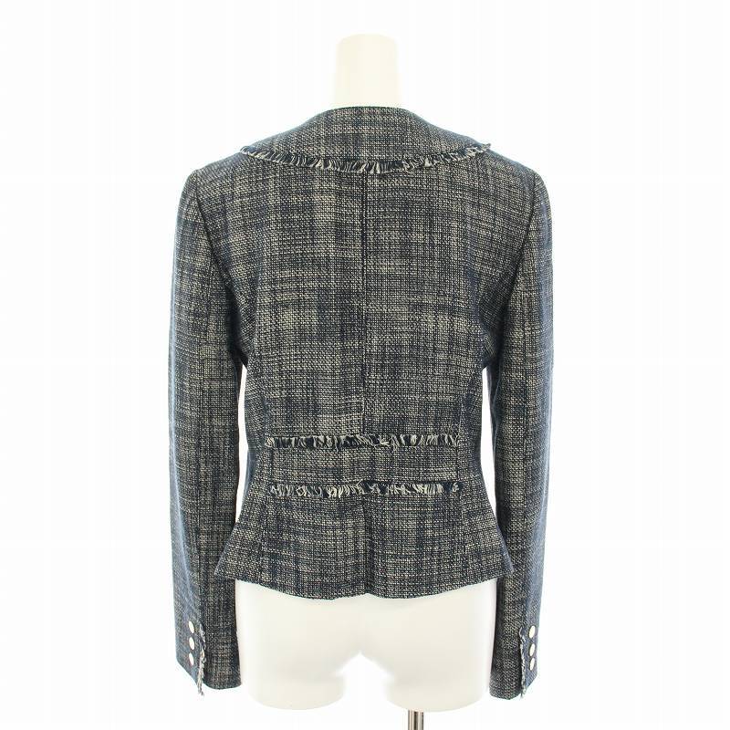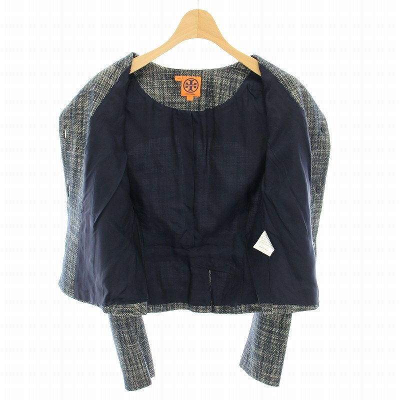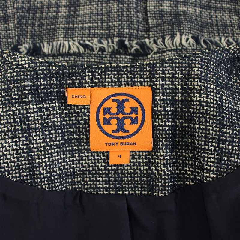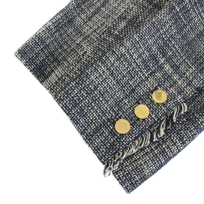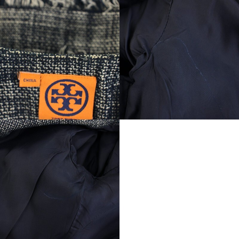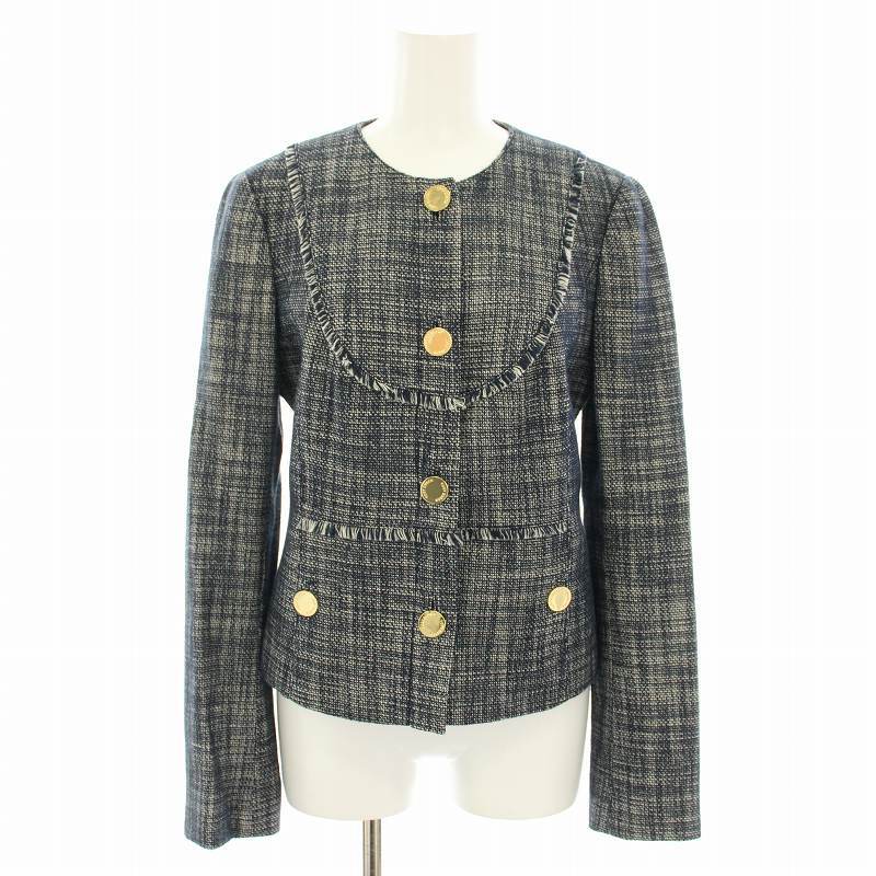トリーバーチ TORY BURCH ノーカラージャケット ツイードジャケット アウター フリンジ チェック柄 4 紺 ネイビー 32101531 レディース