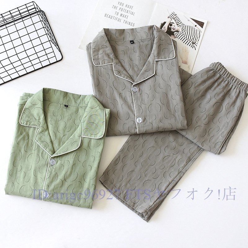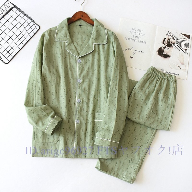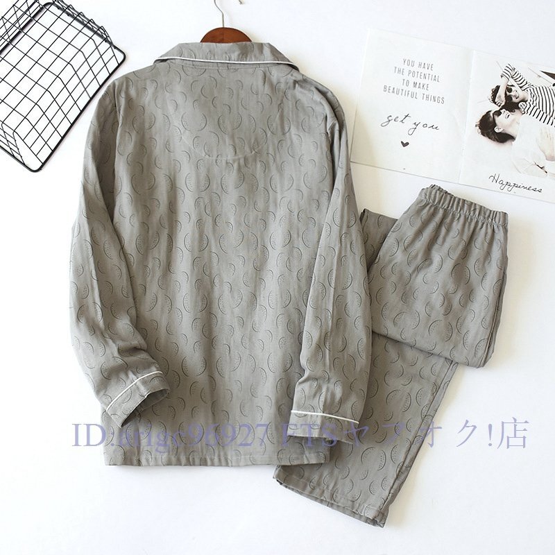 ★新品パジャマ ガーゼパジャマ 二重 メンズ ルームウェア 綿100%ガーゼ 前開き 長袖 長ズボン やさしい肌触り 部屋着 春夏秋冬 グレー L