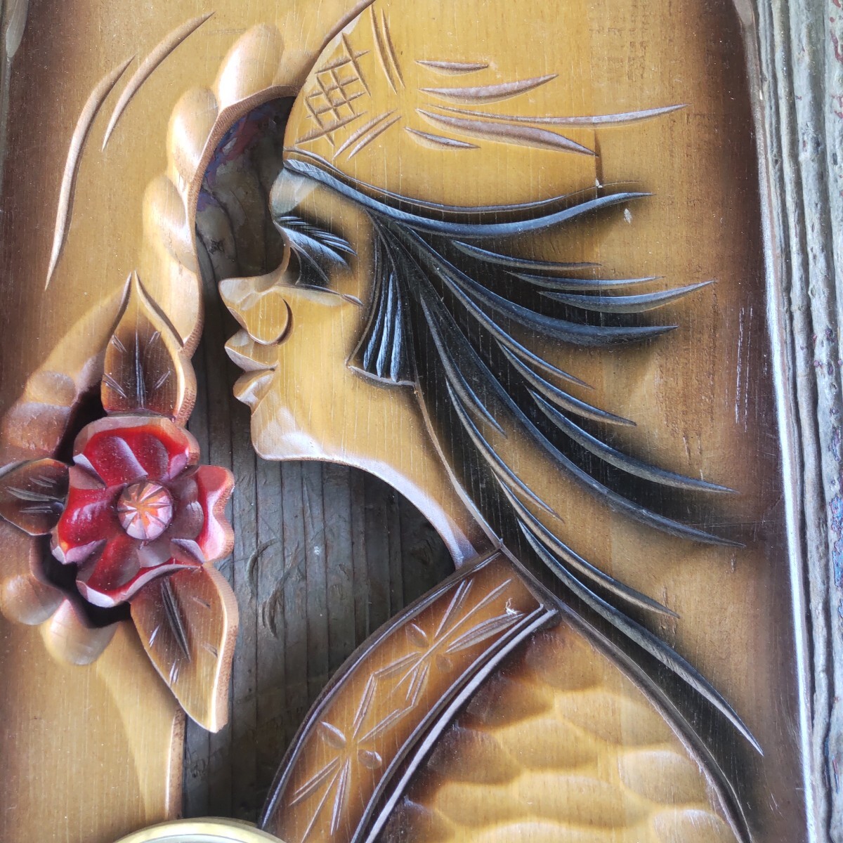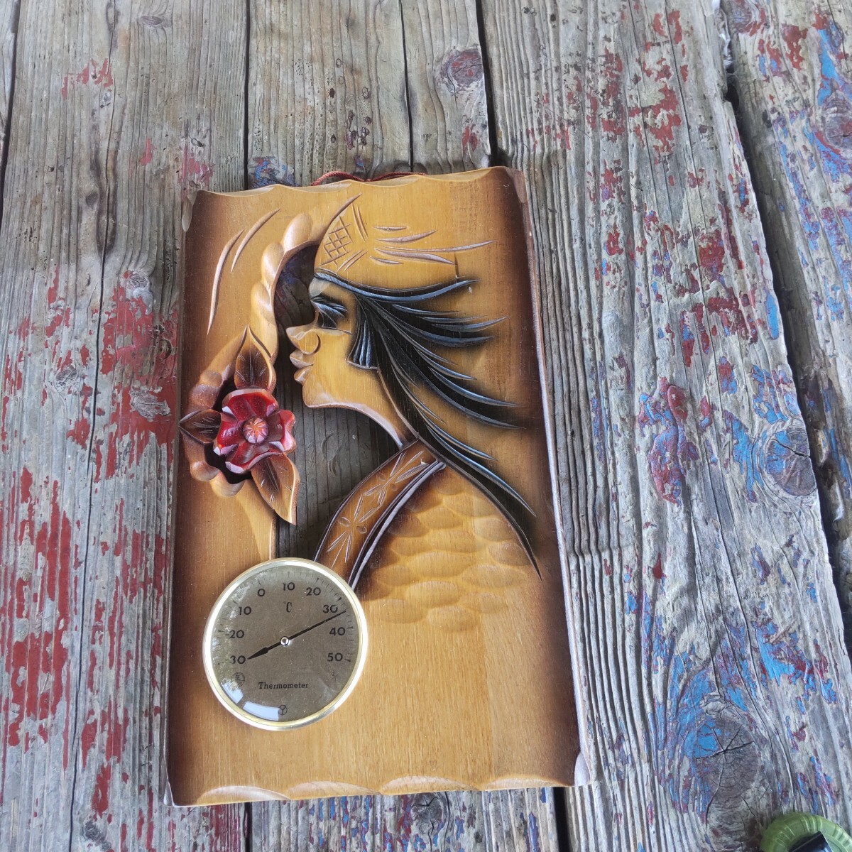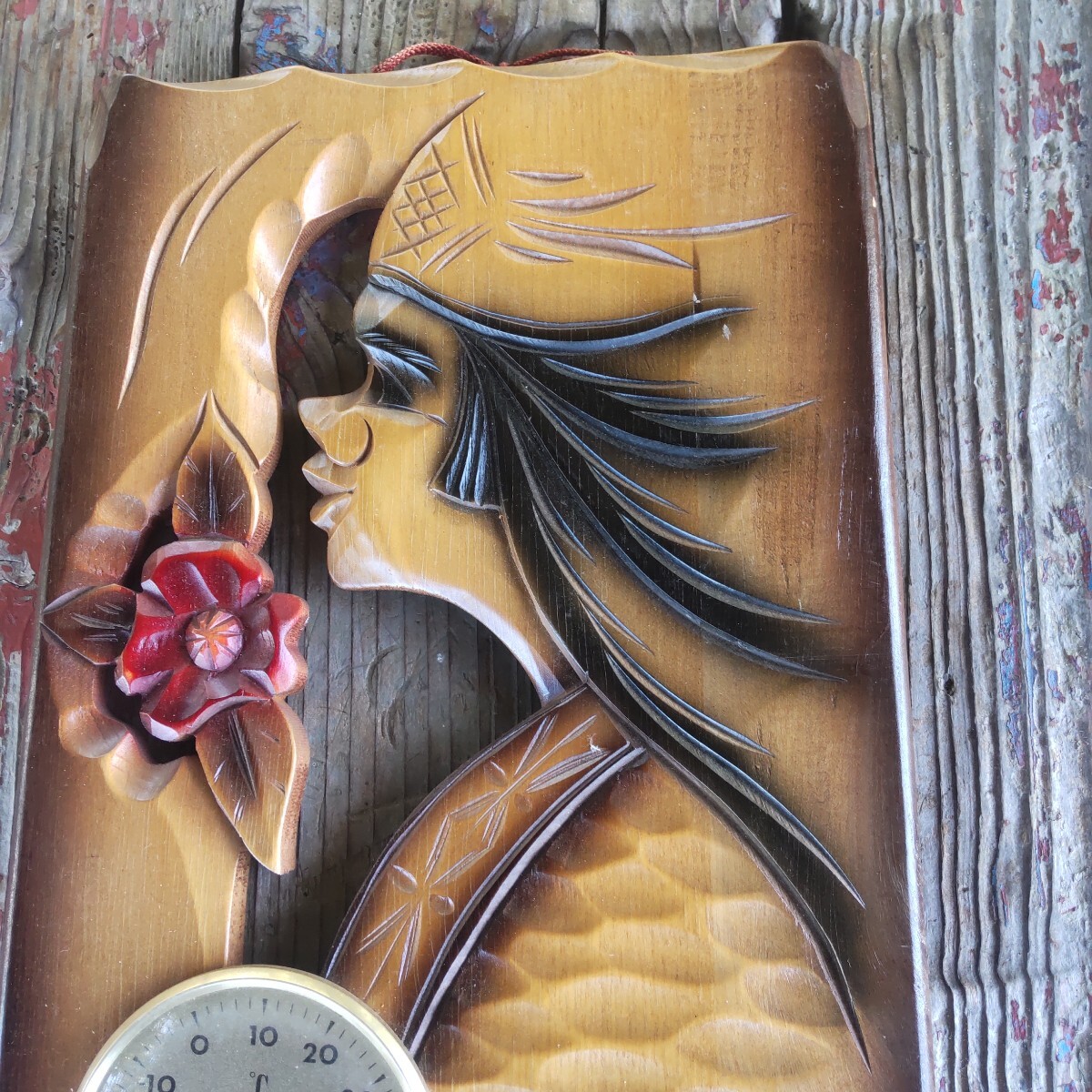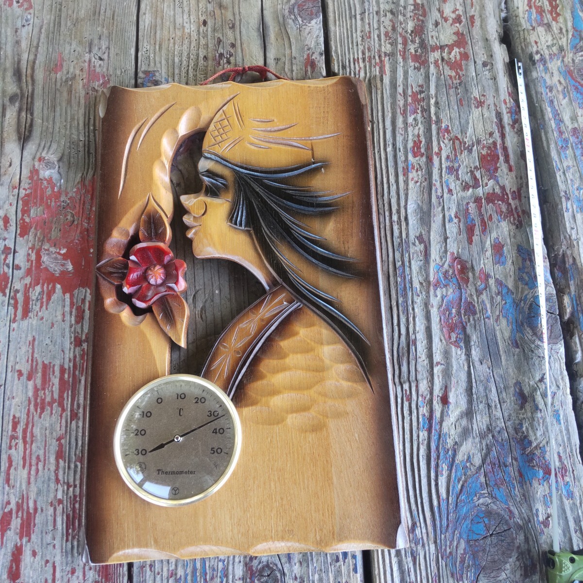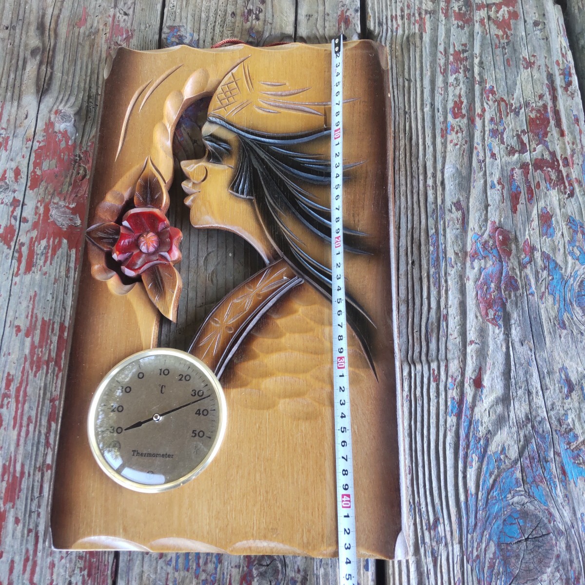 北海道土産アイヌ温度計付き民芸品です。目立ちませんが、下の部分に小さな割れ目有ります(写真10)。椿と乙女です。温度計付き。当方知識が有りません。お好きな方インテリアに日常使いに。温度計今でも、お使いに成れます。