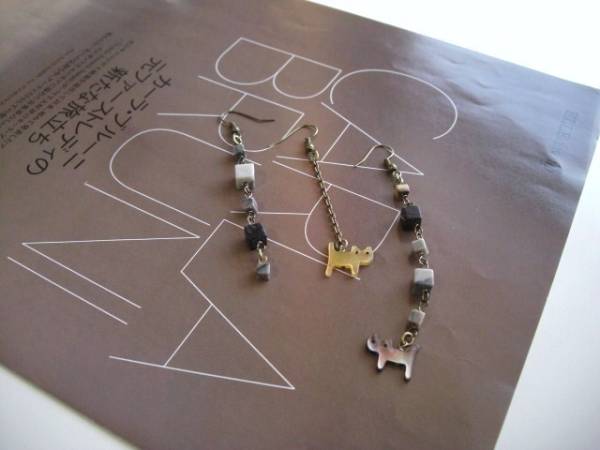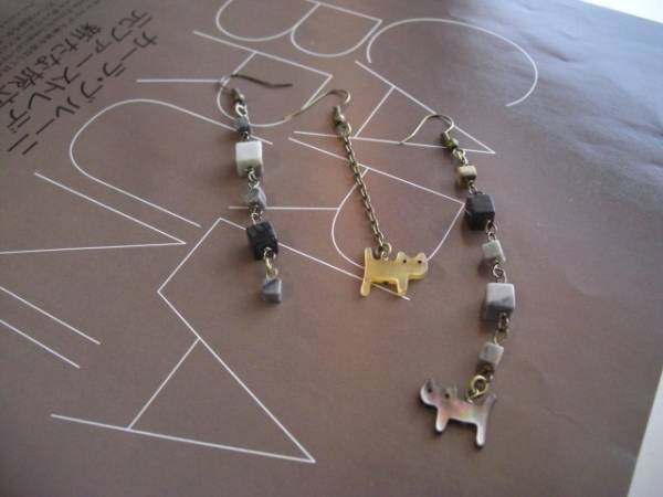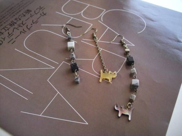 特別な一日・・シリーズです♪お散歩猫さん・・シックなジャスパーのピアスです♪デザイン違いの3本セットです♪色々な組み合わせで楽しんでいただけます♪お揃いのペアでもお作り出来ます♪個性的なキューブのピクチャージャスパーに黒蝶貝の猫さんを合 わせて大人可愛いデザインです♪ジャスパーは6ミリ、4ミリのキューブ、猫さんは15×13ミリ位です♪長さは左から8・5センチ、7センチ、10センチです♪ お揃いのネックレスやブレスレットや同じデザインのうさぎさんも出品しています♪♪シン プルで飽きのこないいつまでも着けられるデザインを 考えて作りました!ハンドメイドをご理解頂いてノークレーム、ノーリターンでお願いします