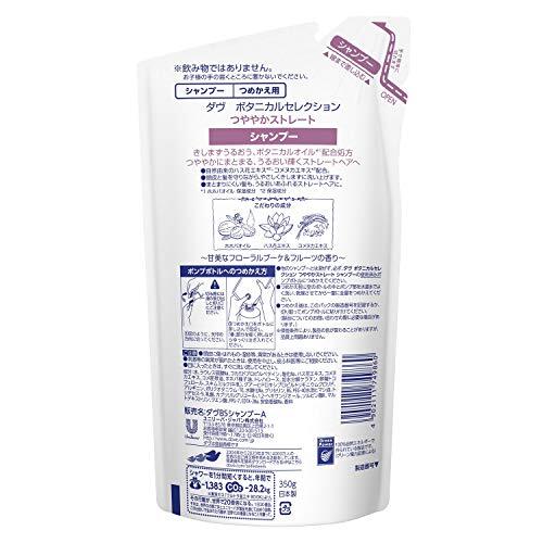 ・ 350グラム (x 1) ・・FlavorName:シャンプー つめかえ・原産国:日本・内容量:350g・髪質:全髪質対応・ボタニカルオイル配合・甘美なフローラルブーケ、フルーツの香り商品紹介 【特徴】 ●ダヴ ボタニカルセレクション つややかストレート シャンプー&コンディショナー。つややかにまとまる、うるおい輝くストレートヘアへ。 ●きしまずうるおう、100%植物由来のボタニカルオイル*1配合処方。自然由来のハス花エキス*2・コメヌカエキス*2配合。 ●甘美なフローラルブーケ&フルーツの香り ●2つの無添加:合成着色料、シリコン* *シャンプーのみ ●NEW ボタニカルセレクション。100%植物由来のボタニカルオイル*1配合。髪うるおってきしまない。 ●頭皮と髪を守りながら、やさしくきしまずに洗い上げます。まとまりにくい髪も、うるおいあふれるストレートヘアに。 【商品説明】 ダヴ ボタニカルセレクション つややかストレート シャンプー。きしまずうるおう、ボタニカルオイル*1配合処方。つややかにまとまる、うるおい輝くストレートヘアへ。自然由来のハス花エキス*2・コメヌカエキス*2配合。頭皮と髪を守りながら、やさしくきしまずに洗い上げます。まとまりにくい髪も、うるおいあふれるストレートヘアに。甘美なフローラルブーケ&フルーツの香り。 *1 ホホバオイル:保湿成分 *2 保湿成分 使用上の注意 ●頭皮に傷・はれもの・湿疹等、異常があるときは使用しないでください。 ●刺激等の異常が現れたときは、使用を中止し、皮ふ科医等にご相談ください。 ●目に入ったときは、すぐに洗い流してください。 原材料・成分 水、ラウレス硫酸Na、コカミドプロピルベタイン、塩化Na、ハス花エキス、コメヌカエキス、コメ胚芽油、ホホバ種子油、トレハロース、加水分解ケラチン、酢酸トコフェロール、スキムミルク(牛乳)、グアーヒドロキシプロピルトリモニウムクロリド、アルギニン、ポリクオタニウム-10、水酸化Na、グリセリン、BG、PEG-40水添ヒマシ油、トリデセス-9、乳酸、カプリリルグリコール、1 2-ヘキサンジオール、ソルビン酸K、マルトデキストリン、クエン酸、PPG-7、EDTA-2Na、安息香酸Na、香料