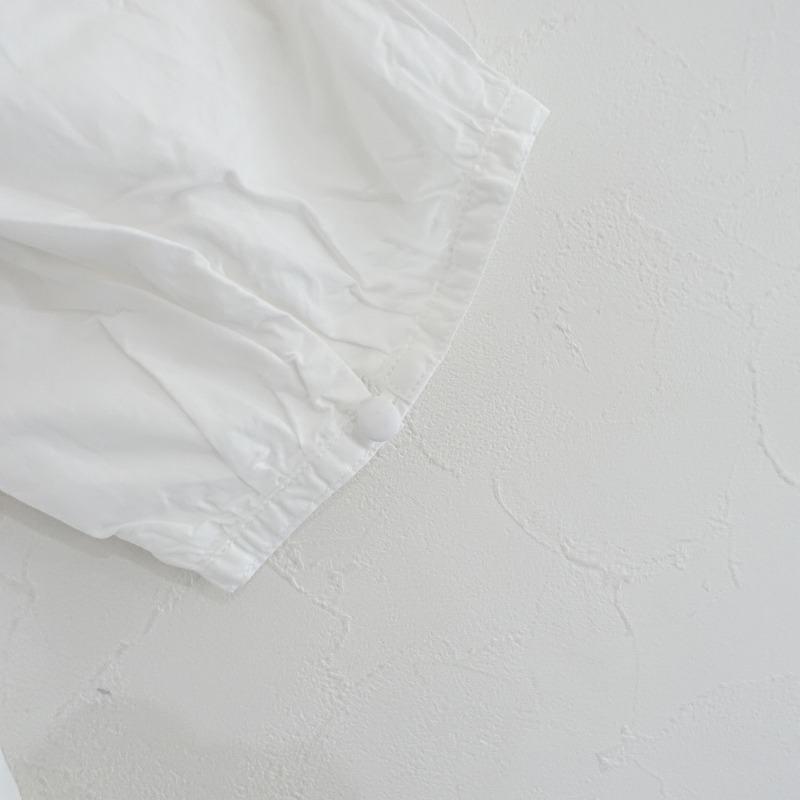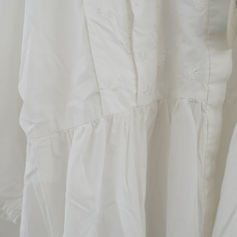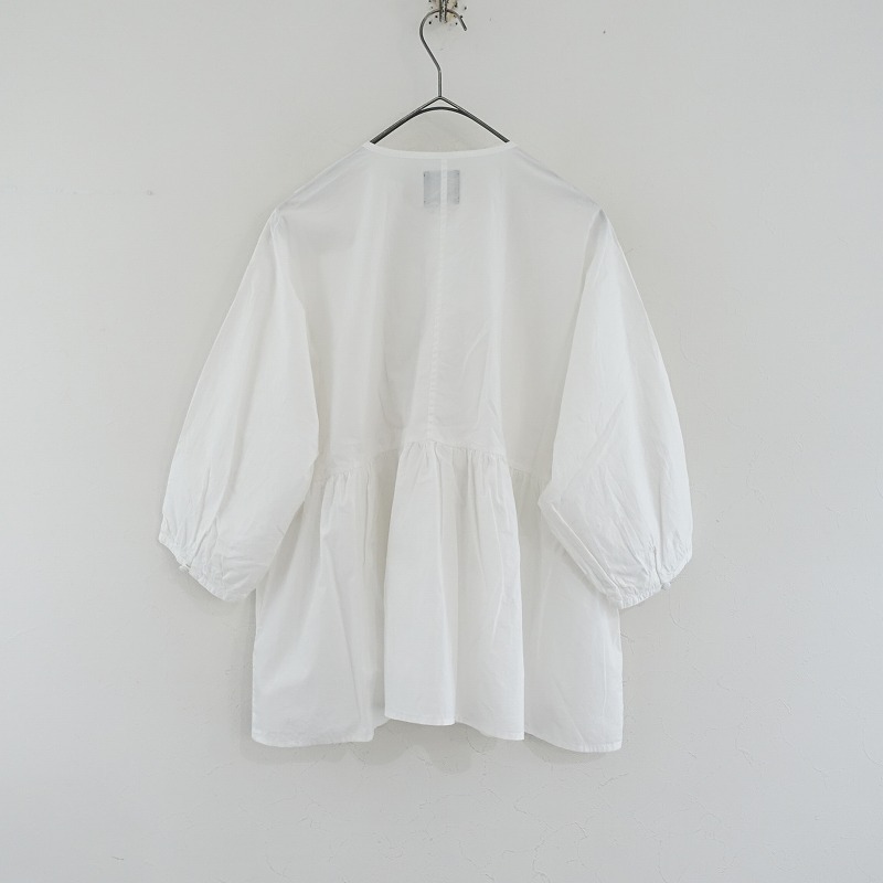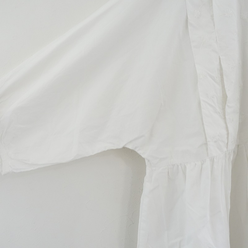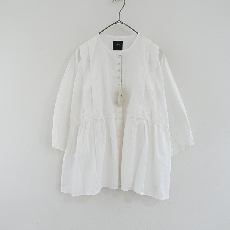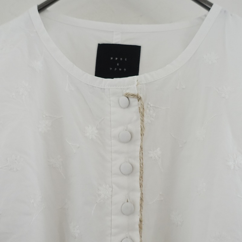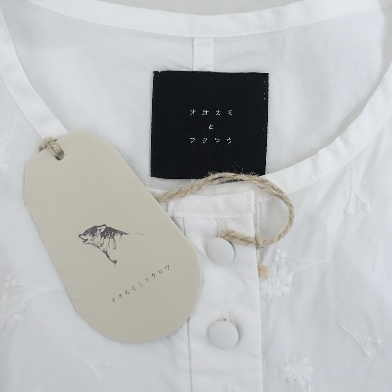 | 2025年春夏コレクション オオカミとフクロウのオオカミと緑につづく青と/EMBペプラムブラウスです。カラーはオフホワイトです。少し透け感がある、密に織られたコットンの薄手生地を使用。フロントがクルミボタンと比翼ボタン仕様のペプラムブラウスです。フロント胸元は花の刺しゅうを配し、タックがあしらわれております。袖口はギャザーを寄せ、ボタン・ループ留めです。ポケットはございません。定価(メーカー希望小売価格)15,400円の商品です。 |