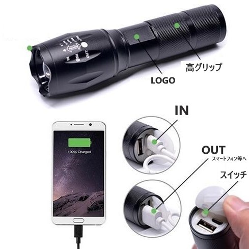 USB充電ポートが搭載され、大容量バッテリー内蔵で電池交換が不要!小型なのに驚異の3800LMを実現!最大500m先までの有効距離を直射可能です。さらに懐中電灯の内部に再充電可能な大容量バッテリーが内蔵されおり、バッテリーを取り外さずにUSBケーブル(付き)でどこでも充電できます。