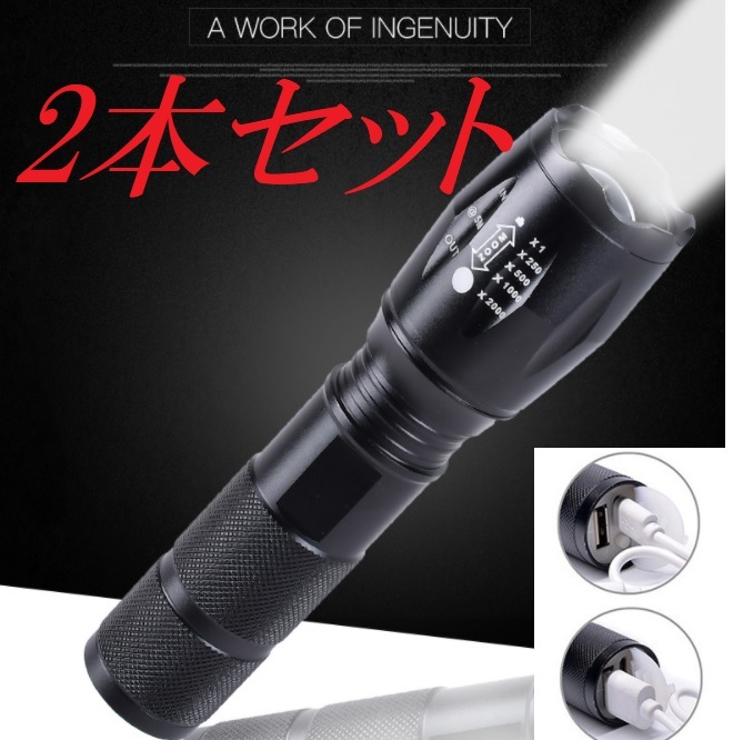 超明るいLED懐中電灯(2個セット)防水LEDランプ高輝度ライト/USB充電式 キャンプ 夜釣り 夜間巡回