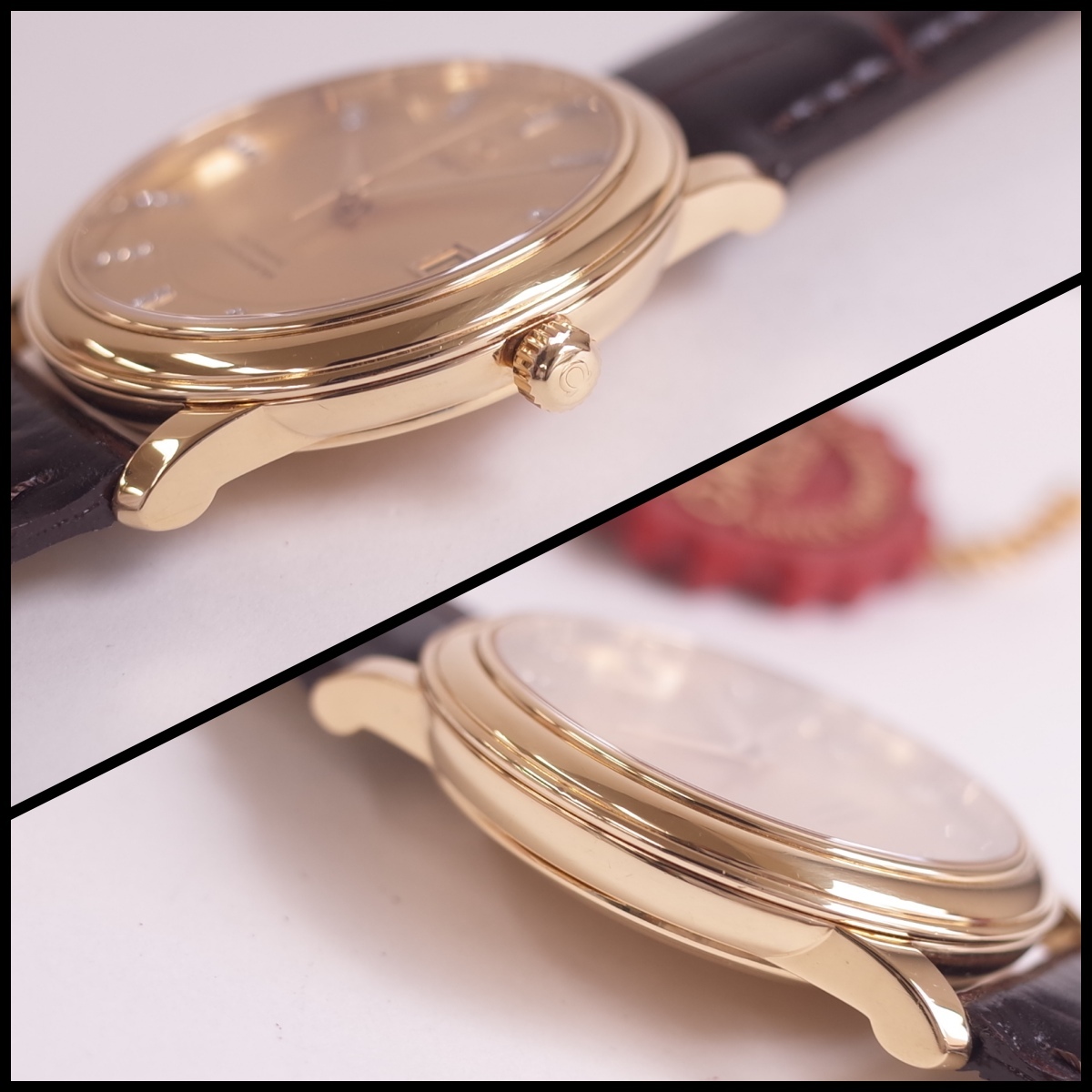 コンディション | Aランク ケースは美品のためライトに磨き仕上げ済 塵キズあり、目立つ打痕なく良好 ダイヤルはシミヨゴレなく美品、秒針にわずかにプツプツあり、OMEGAマークにわずかにくすみあり、風防も美品 |