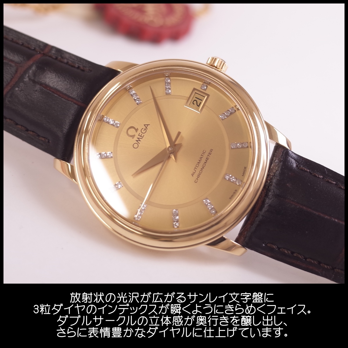 放射状に光を反射するサンレイ仕上げのゴールド文字盤が、エレガントな輝きを放つフェイス。 インデックスには、3粒ずつ配されたダイヤが瞬くように煌めき、ラグジュアリーな印象を添えます。 ダイヤル外周と内側に施された二重のサークルが奥行きを与え、立体感のある表情豊かなデザインに。 洗練された中にも華やかさを感じさせる、特別な一本です。 |