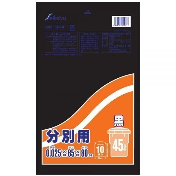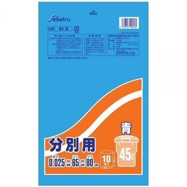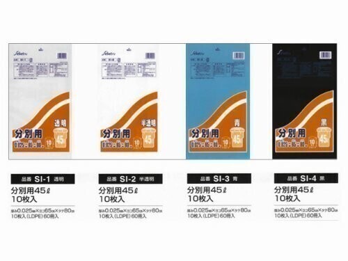 | ●分別用ごみ袋45L ●厚み0.025mm ヨコ幅65cm タテ80cm ●材質:LDPE(低密度ポリエチレン) ●袋の素材は透明度が高く柔らかく伸びるのが特徴です ●透明度が高く中身が良く見えます ●透明・半透明・青・黒の4色よりお選び下さい 【商品詳細】 容量:45L サイズ:厚み0.025mmXヨコ幅65cmXタテ80cm 材質:LDPE(低密度ポリエチレン) 色:透明/半透明/青/黒 内容量:1パック10枚入り 生産国:中国 型番:透明SI-1/半透明SI-2/青SI-3/黒SI-4 JANコード: 透明 4976797109546 半透明 4976797109553 青 4976797109560 黒 4976797109577 製造メーカー:株式会社セイケツネットワーク |