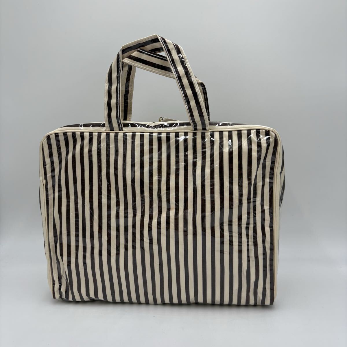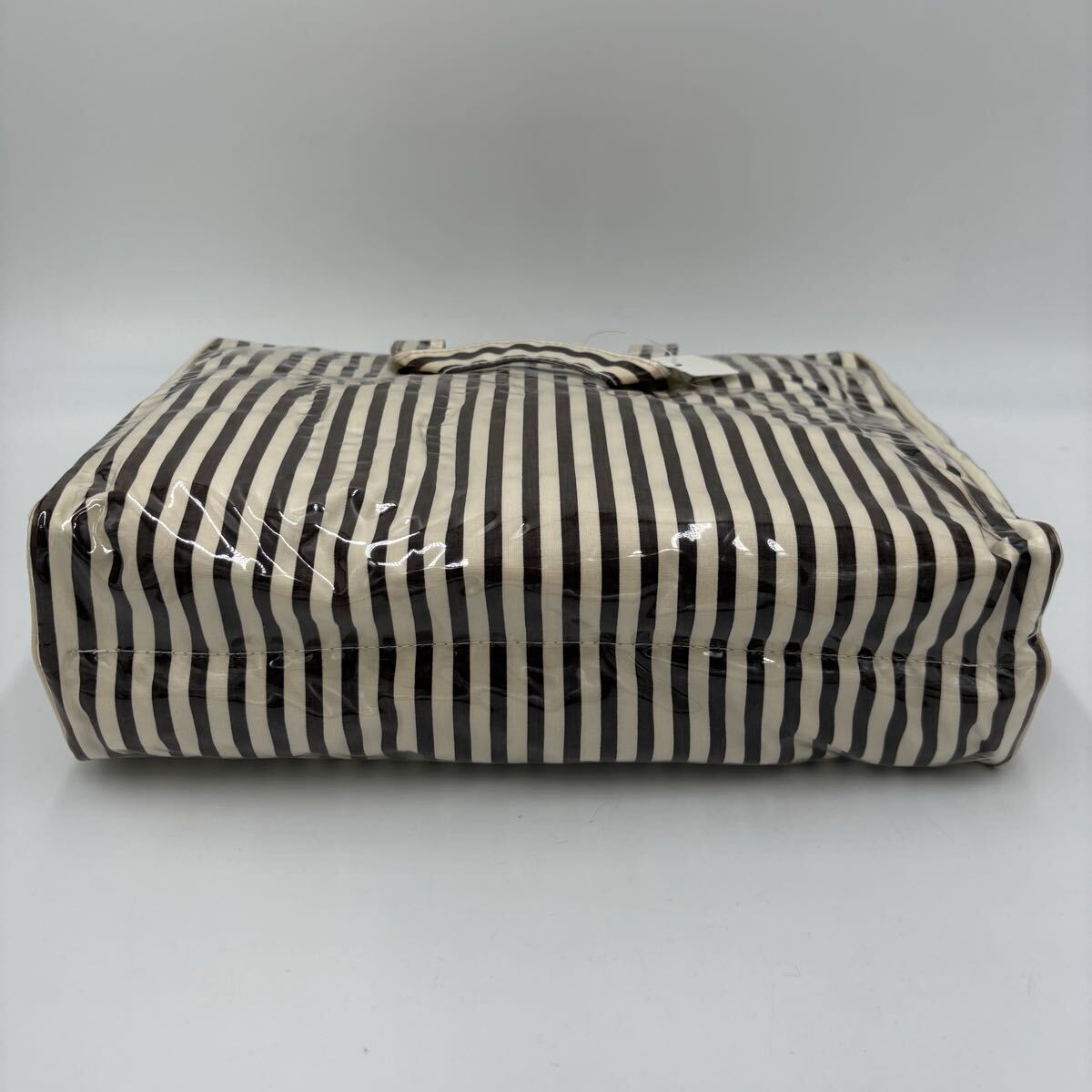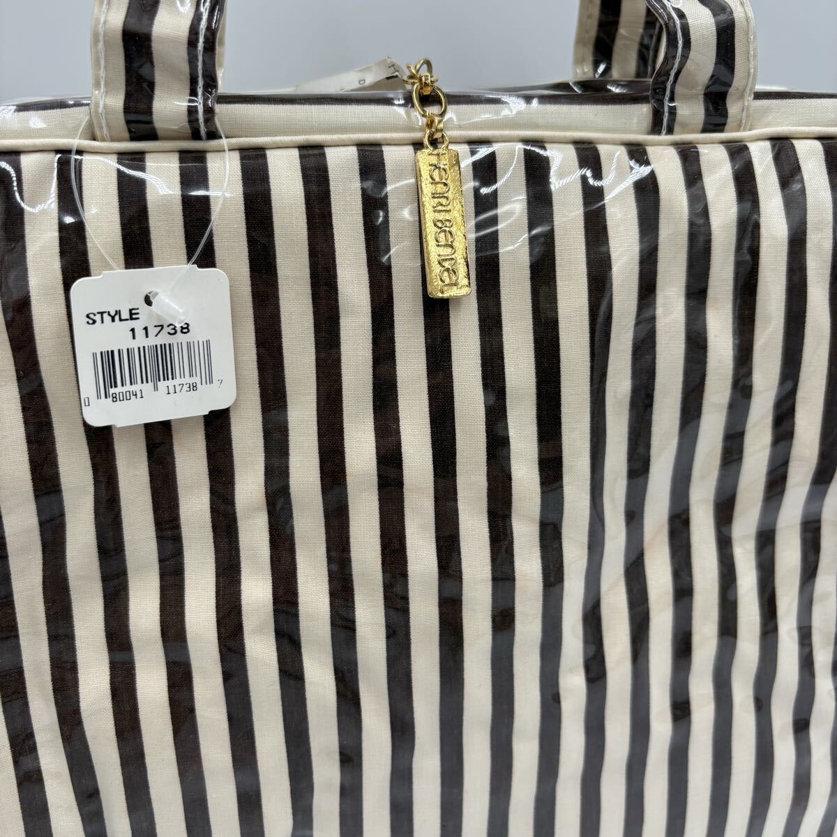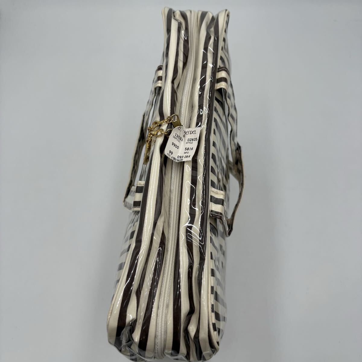 D ■ 使い勝手抜群 '米国製' 定番 茶白ストライプ柄 HENRI BENDEL ヘンリベンデル 大きめ 収納ケース トートバッグ 手提げ鞄 カバン USA製