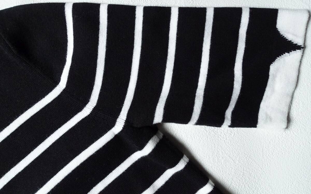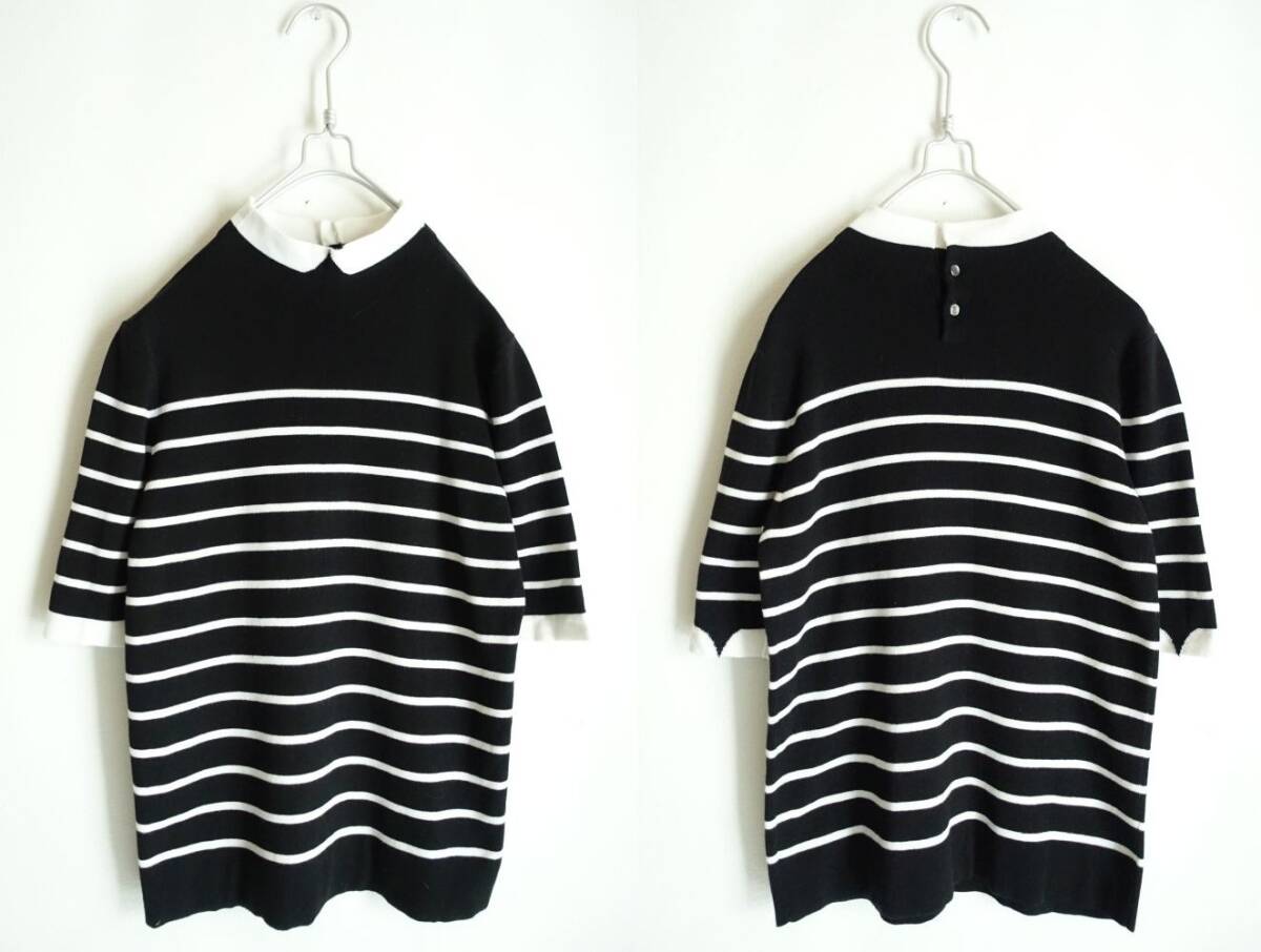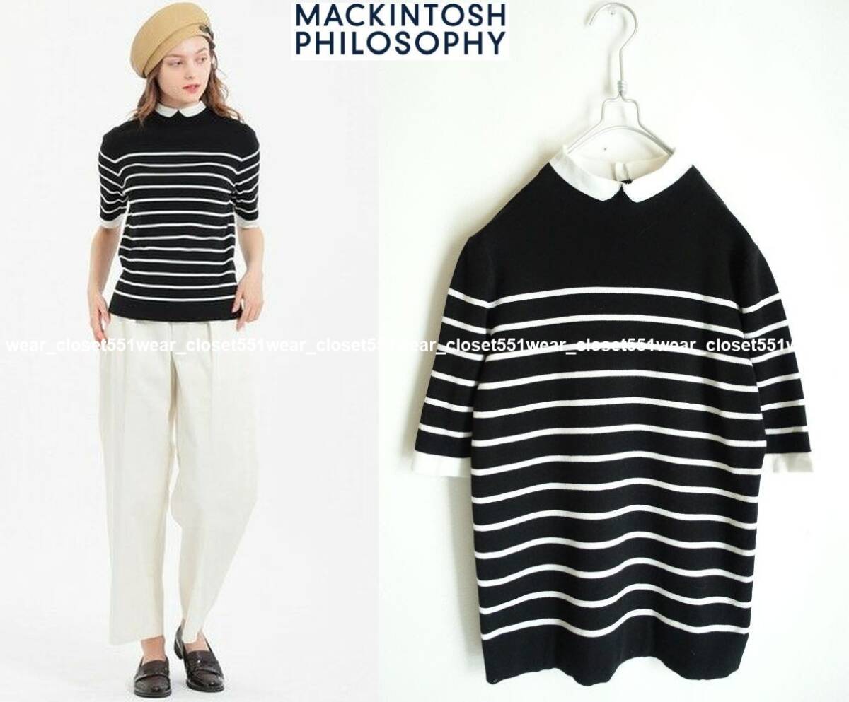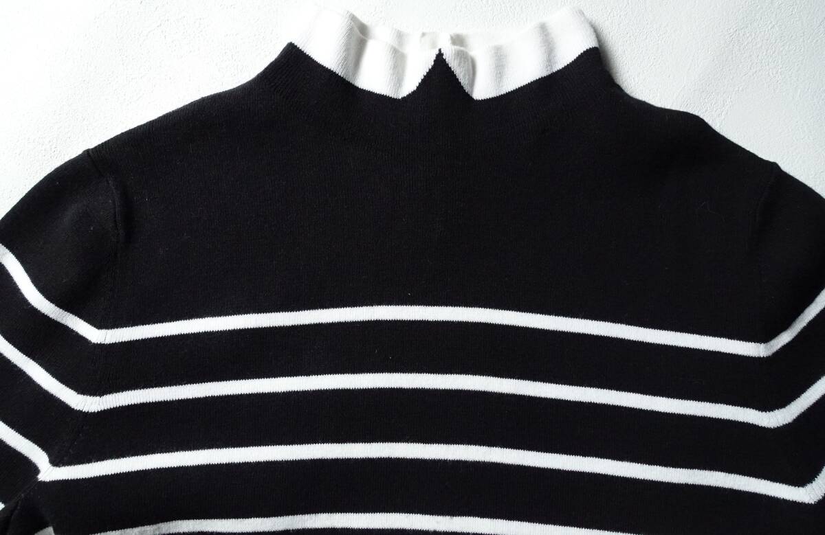 MACKINTOSH PHILOSOPHY 大人気の五分袖Cleric Collar Knit プルオーバー。2023S/Sの定価19800円。36サイズはオンラインストア、ジェイアール名古屋タカシマヤ店、阪急うめだ本店のみでの取扱い品。ボトルネックの端から襟が出ている様なトロンプルイユ柄のインターシャニット。袖口の配色もポイント。インドコンパクトコットンのセミハイツイスト糸を使用。毛羽が少なく、春夏に適したサラッとした風合いが特徴の綿糸ボトムとの相性抜群で、シンプルなパンツやスカートと合わせるだけでトラッドでフェミニンなコーディネートが完成します。