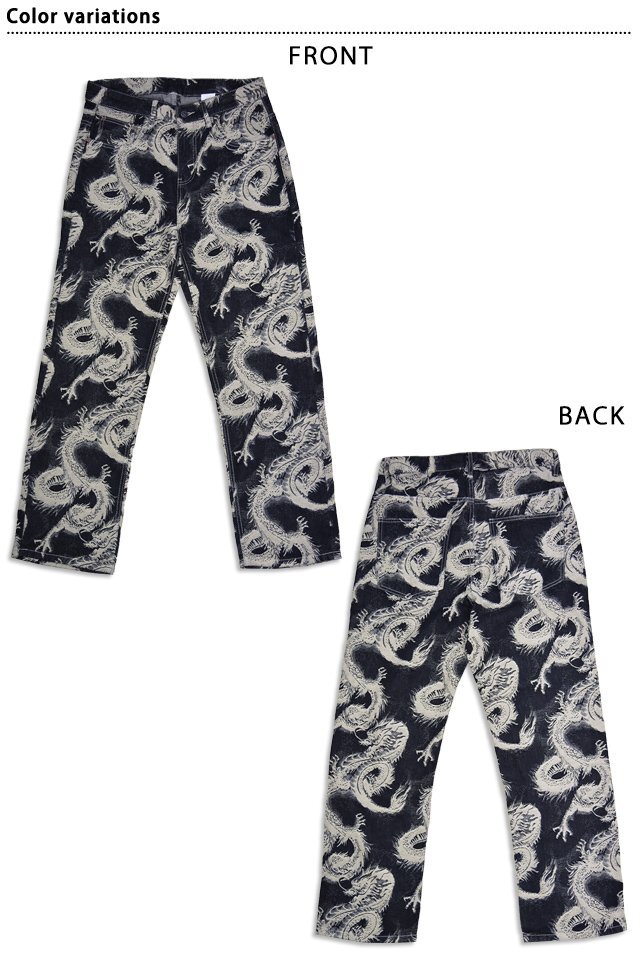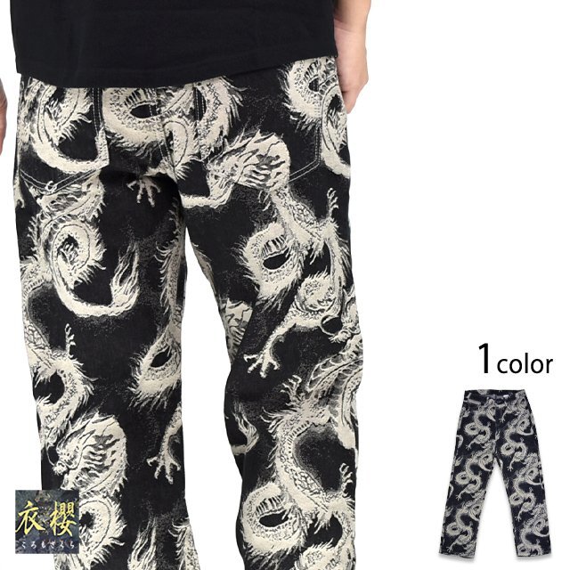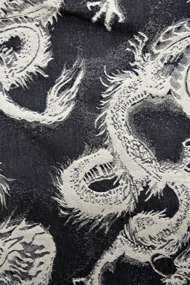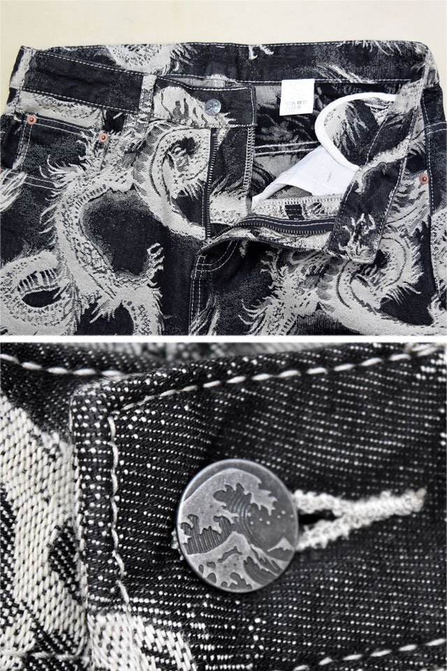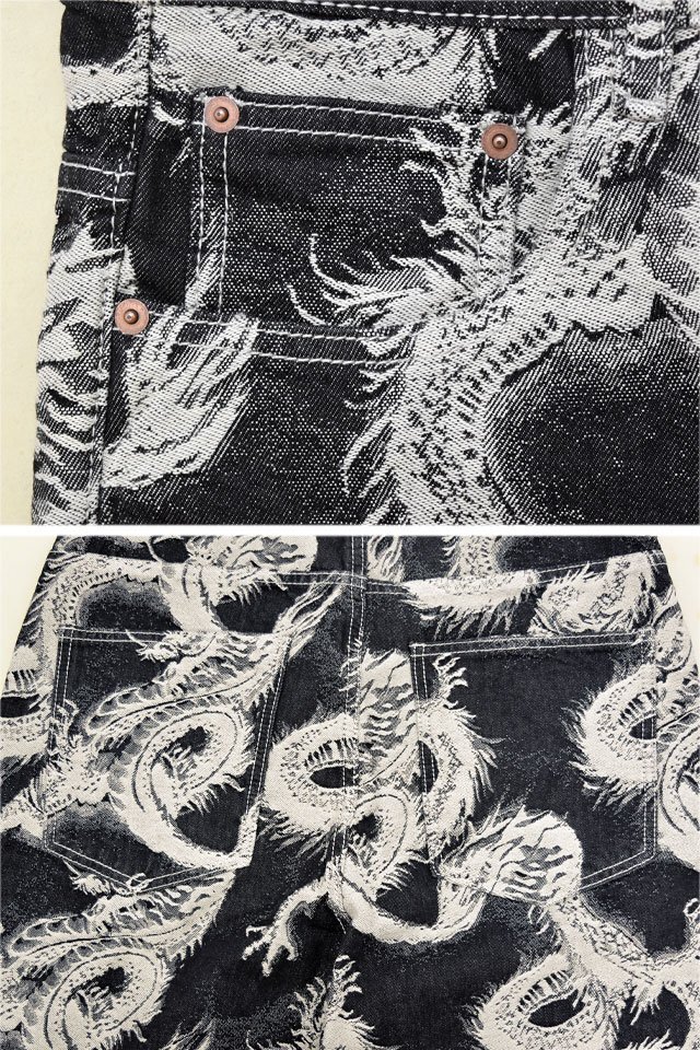 味わい深い物作りをされている衣櫻さんから「白龍デニムジャガード織ワイドジーンズ(SA-1732)」のご紹介です。 白龍をジャガード織りで落とし込んだ、総柄のデニムパンツです。 こちらの製品は、一枚ずつ全て色柄出しが異なっており、全く同じものは世界に二つと存在しない逸品となっております。 トップには、富獄三十六景ボタンを採用。 フロントはジッパーフライ仕様です。 ボディー全体にジャガード織が施されているため、ごわつきが少なく、柔らかな素材感も魅力のひとつ。 ゆったりとしたワイドシルエットで、楽に穿いて頂けます。 | ||||||||||||||||||||||||||||||