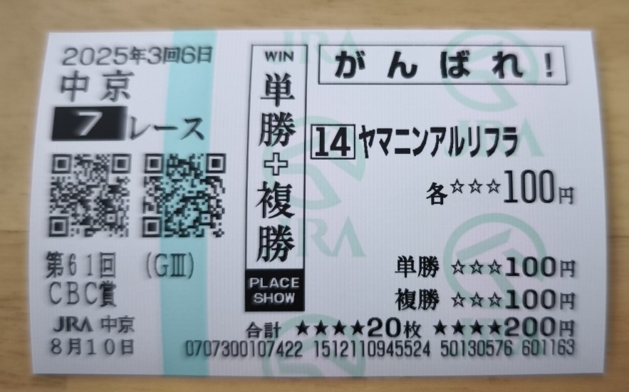 こちらの商品は、2025年8月10日に行われた中京7R・第61回CBC賞に出走したヤマニンアルリフラの現地単勝・複勝馬券です。