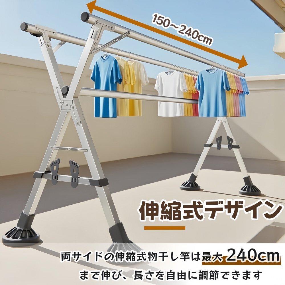 【 独特なデザイン】①部屋干しには、木製フロアを傷つけずに安定性を高める超大型の防滑フットパッドが付属しており、屋外での風に強い性能も向上しています。②洗濯干しは、使用中に手や衣類を傷つけるのを防ぐために、伸縮ポールの保護カバーが付いています。③また、物干し竿を直接ご利用いただくために、12個のクリップと20個の風防フックが付属しています。