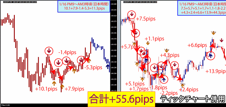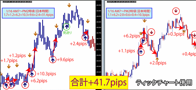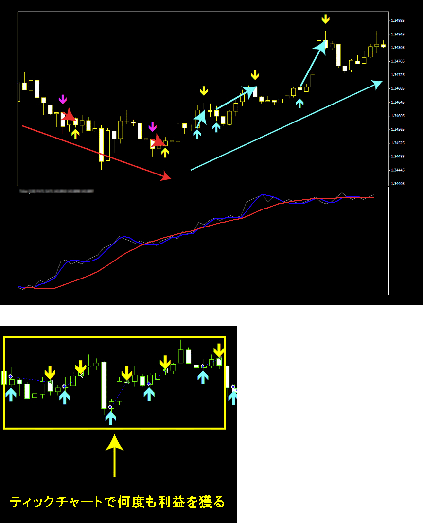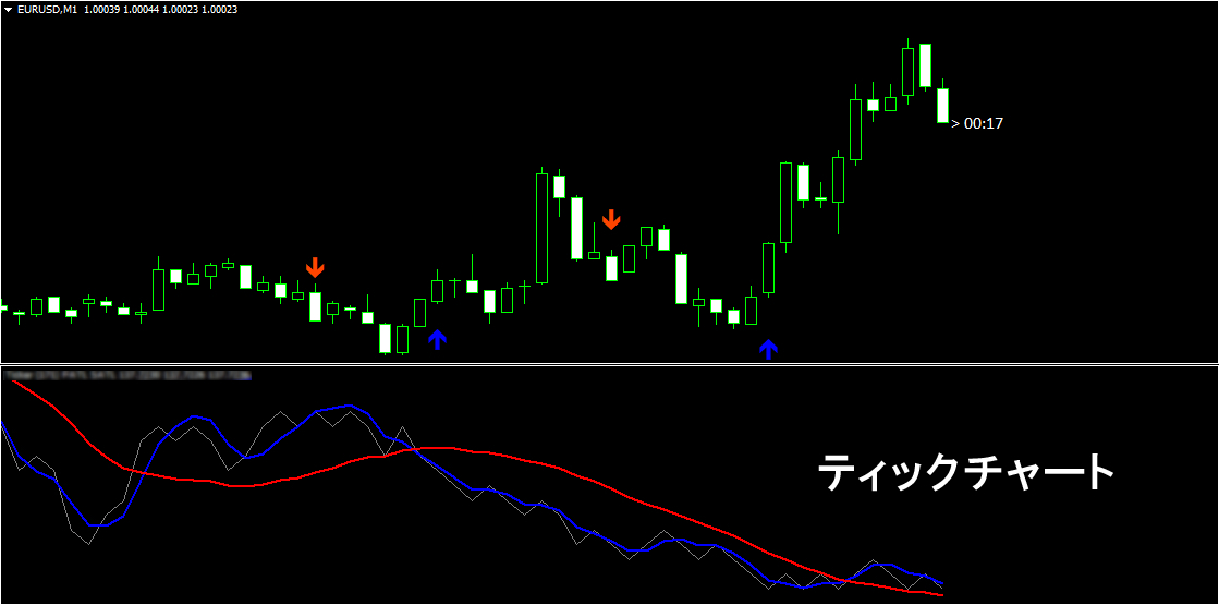 上の画像では、ティックチャートと矢印サインツールを為替の進む方向性に沿ってエントリーできるように組みわせています。