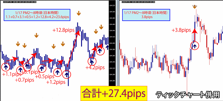 一般的にはレンジスキャルピングではアジア時間、トレンドスキャルピングは欧米時間で使用する方が良く、ティックチャートが効果的にポジション取りを判断することになります。