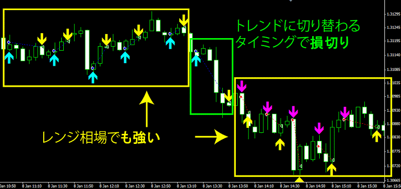 矢印シグナルにはポジションの方向性(トレンド・レンジ)を決めるフィルターが実装されています。