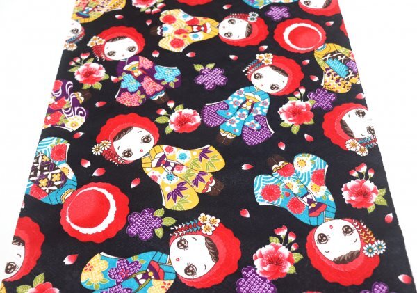 | 【京わぎれ】正絹 友禅染はぎれ お人形柄 (文化人形 振袖姿) 黒地 破れサヤに桜(小サヤバック)地紋 表物用生地 1.4m ① | ||||
