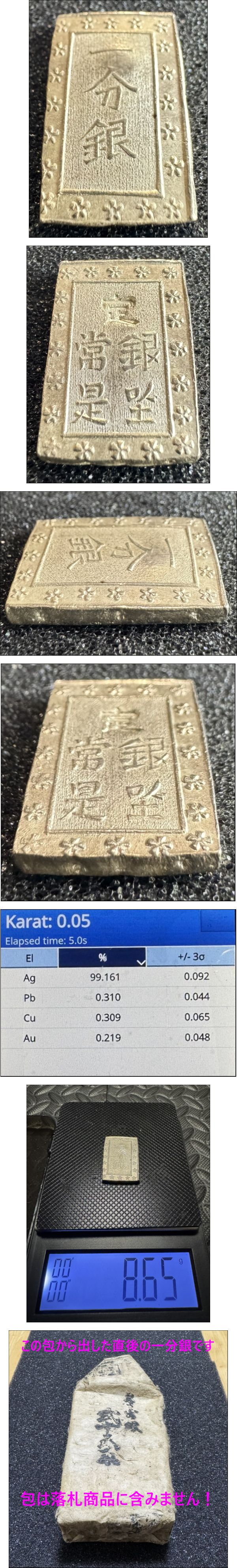| 商品説明 | 【商品内容】 希少 【天保一分銀 Po】 包出し 美品 【品位】 銀99.161%/金0.219% OLYMPUS VANTA 蛍光X線分析計機 (約400万円)で測定。 鑑定結果は写真に掲載しています。 【量目】:8.65g 【状態】: 銀座オークションにて落札した一分銀、包出しです。 一分銀の包を開封した中の品物です。 画像にある包の中から出しました。 包は落札商品に含みません! 【天保一分銀 Po】となります。 コンディションは写真でご判断ください。 現状で気に入っていただける方のみお願い致します。 計量器は安価な物ですので多少の誤差はあると思います。 発送は【おてがる配送ゆうパケットポスト】を選んでいただき コインホルダーに入れ、プチプチに包んで発送いたします。 ◆あくまで個人保管品です。 画像にてご判断いただき、ご納得いただける方のみご入札をお願い致します。 また画像には限りがございますので、色味が異なる場合などあるかもしれません。 詳細部分にこだわる方、完璧をお求めになる方、状態に神経質な方もご遠慮願います。 商品状態に関しては個人差がございます。 落札後の商品状態による返品や故障時の補償は一切お断りいたします。 (すり替え防止の為) ◆不要なトラブルを避けるため、3日以内のご決済、 速やかな受け取り連絡をお守り頂ける方のみとしております。 あらかじめご了承ください。 お守り頂けなかった場合、落札者都合キャンセルとさせていただきます。 以上、全てをご了解いただける方のみご入札をお願い致します。 ■新規の方及び、評価が低い方の入札は取り消させていただく場合がございます。 ■領収証の発行は対応しておりません。 |