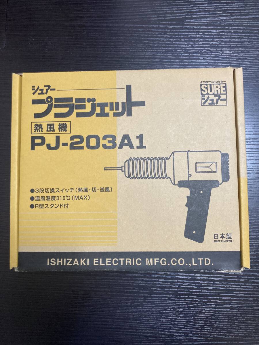 塩ビ溶接専用ヒートガン 商品名 プラジェット・ハンディタイプ(軽量型)_塩ビ溶接専用ヒートガン 品番 / 機種名 PJ-203A1 定格消費電力 AC100V-300W 50/60Hz スイッチ スライド式3段切換スイッチ(切・送風・熱風) 温風温度 約310℃ ※測定は吹出口より3㎜の位置 風圧 1280Pa 本体質量 約740g ※電源コードを除く 本体寸法 本体径 φ70 × 長さ260 × 高さ191㎜ 付属品 フィルター(PJF-1)、R型スタンド(PJ-R)、溶接塩ビ棒・軟質タイプ(PPB-3N)