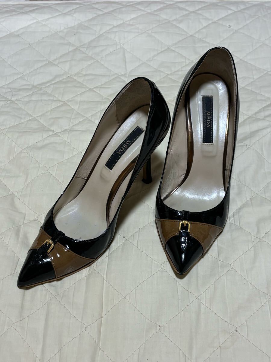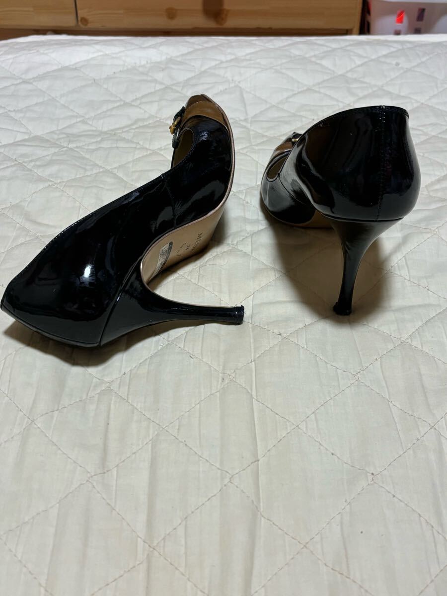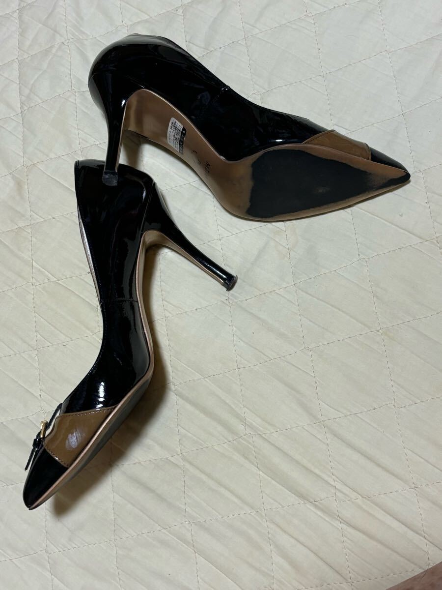 流麗なデザイン、つま先にはベルトをあしらった高級感溢れるパンプスです.ソールはこれまたカッパーゴールドで造られています。中敷に変色有ります。