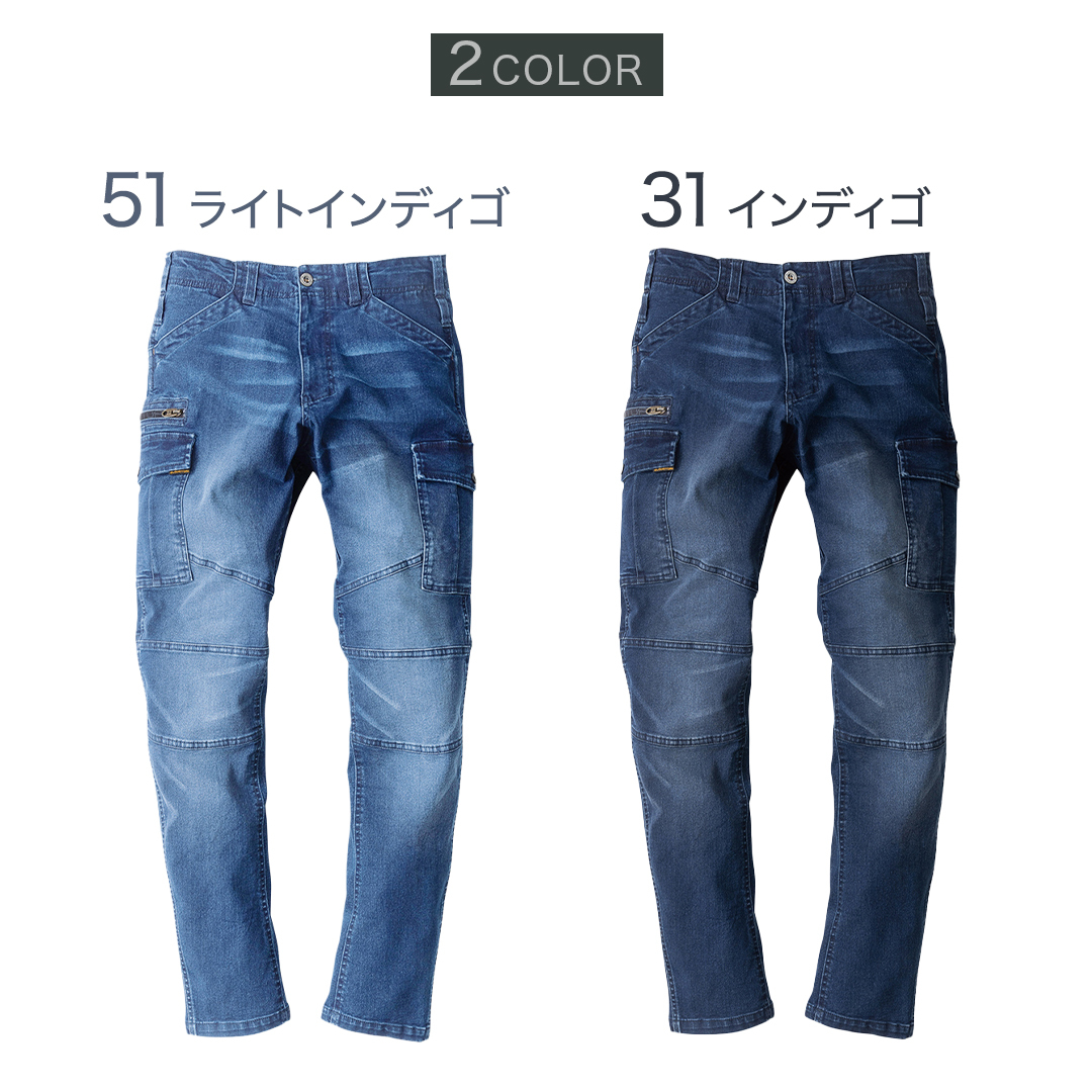7つのポケットを装備した高い収納力にストレッチ、速乾性などの優れた「機能性」とワイルドでおしゃれな「デザイン性」を兼ね備えたデニムストレッチカーゴパンツ。