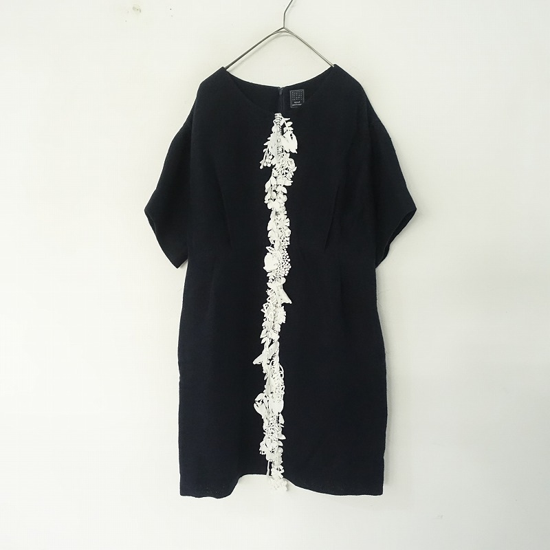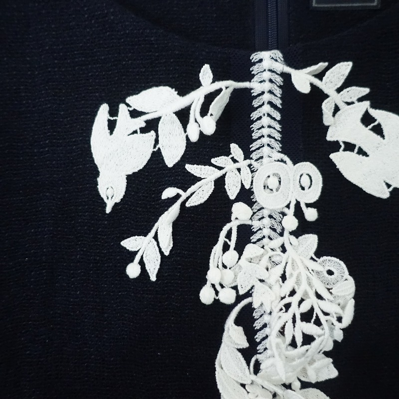 mina perhonenのforest parade リネンブレンドワンピースです。カラーはネイビーで、リネンナイロンのツイードのような織り素材で仕立てられ、裏地付きです。後ろにファスナー付き、前身頃にあしらわれたforest parade の刺しゅうモチーフがアクセントです。両サイドにシームポケット付きです。 |