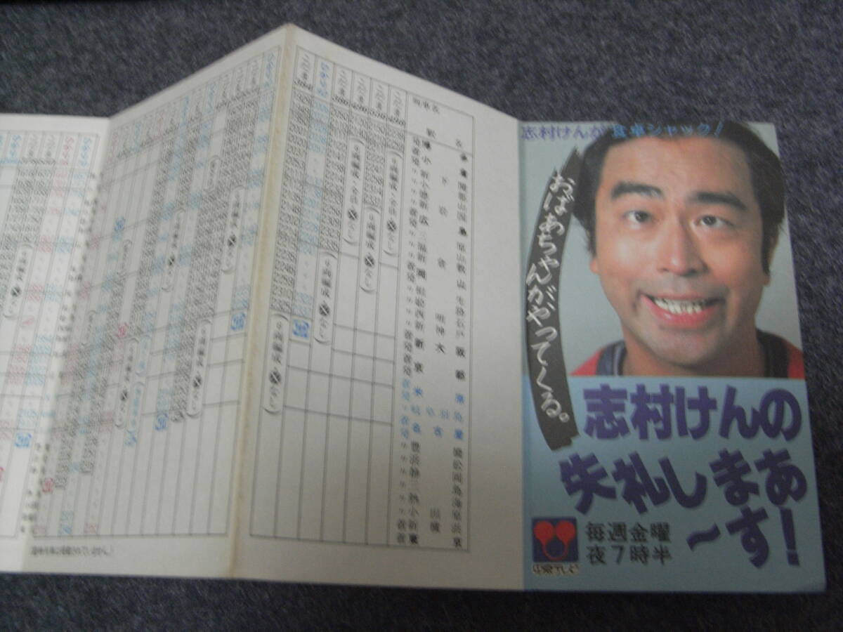 蛇腹折り・両面印刷・東海道山陽新幹線 東京-博多間 全駅全列車掲載・表紙面は中京テレビ「花姉妹」 手塚理美・篠山葉子、裏面は中京テレビ「志村けんの失礼しま~す!」志村けん・中京テレビ「所さんの勝ったも同然」。