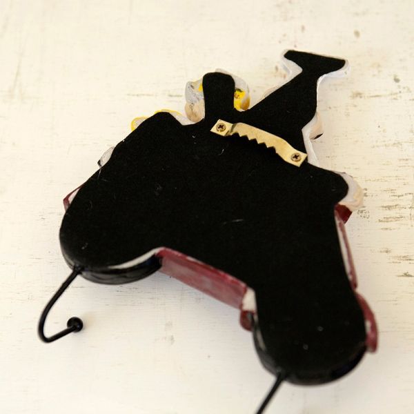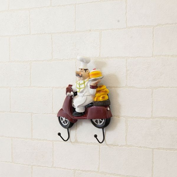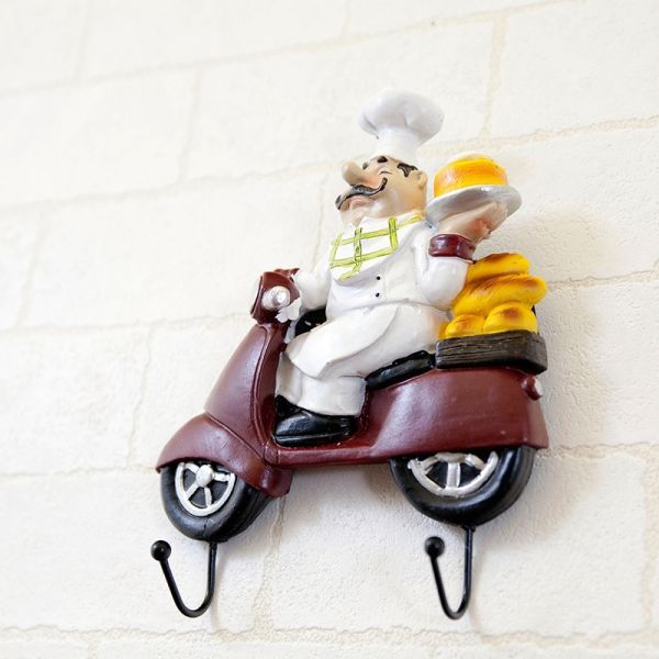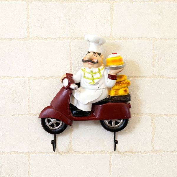 愛らしいおじさんシェフがバイクで配達! 赤いバイクはケーキ、青いバイクはパンを乗せたかわいいデザインのツインフックです。 |