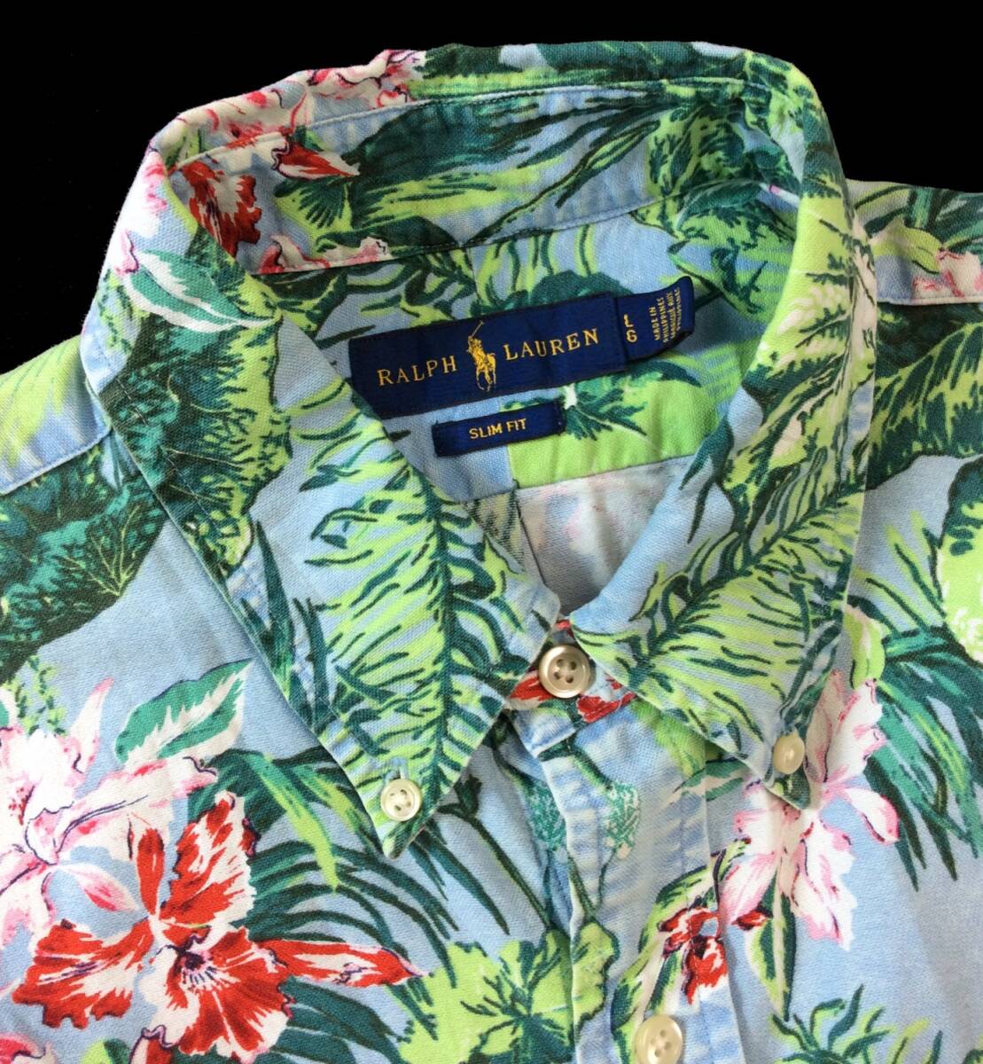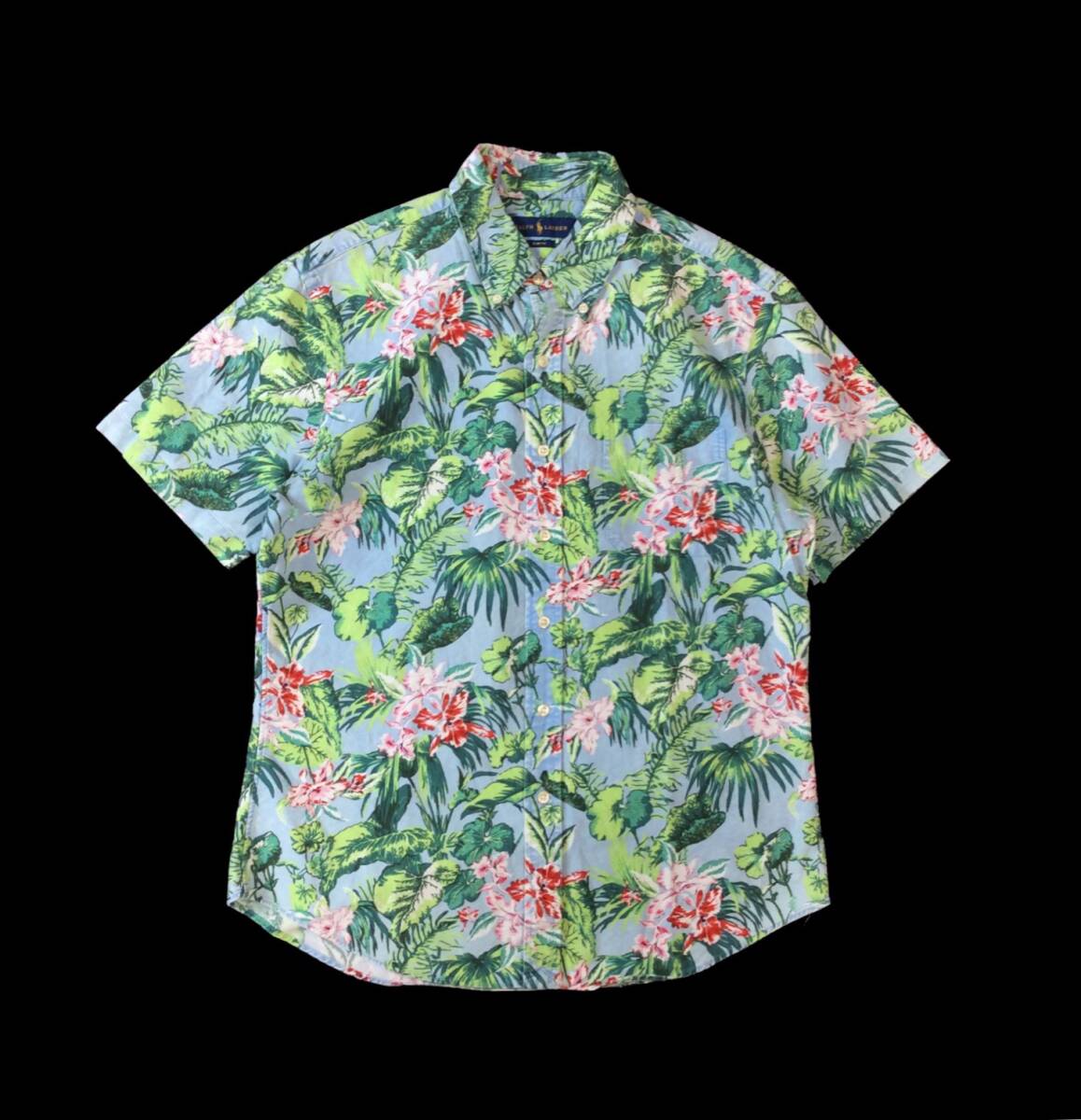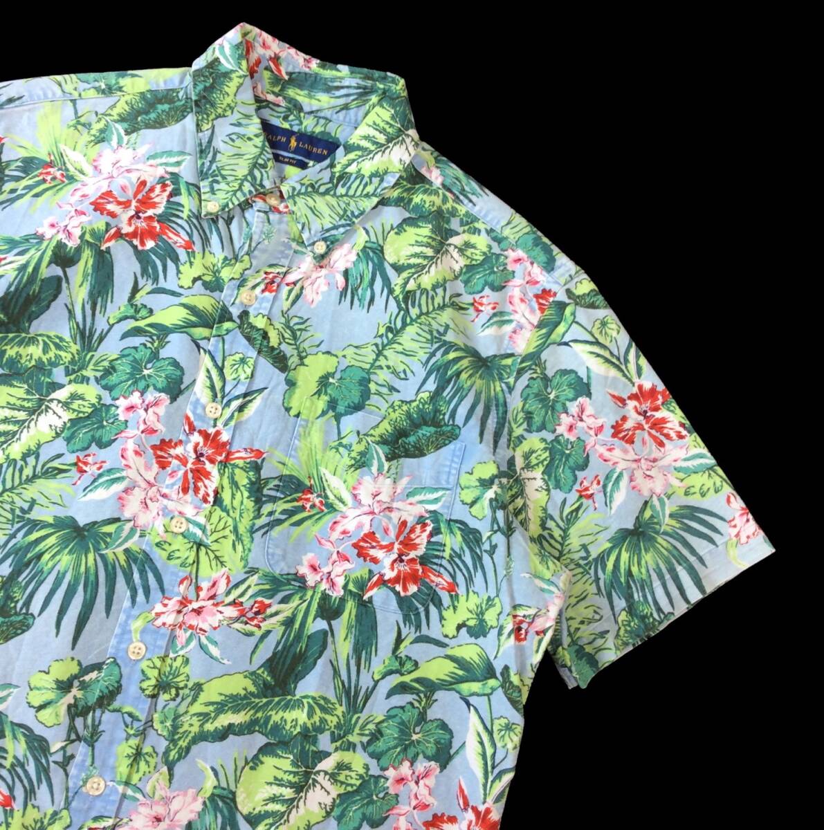 RALPH LAUREN ラルフローレン 花柄 半袖 シャツ アロハシャツ ハワイアンシャツ ボタンダウン SLIM FIT 水色系 メンズ L