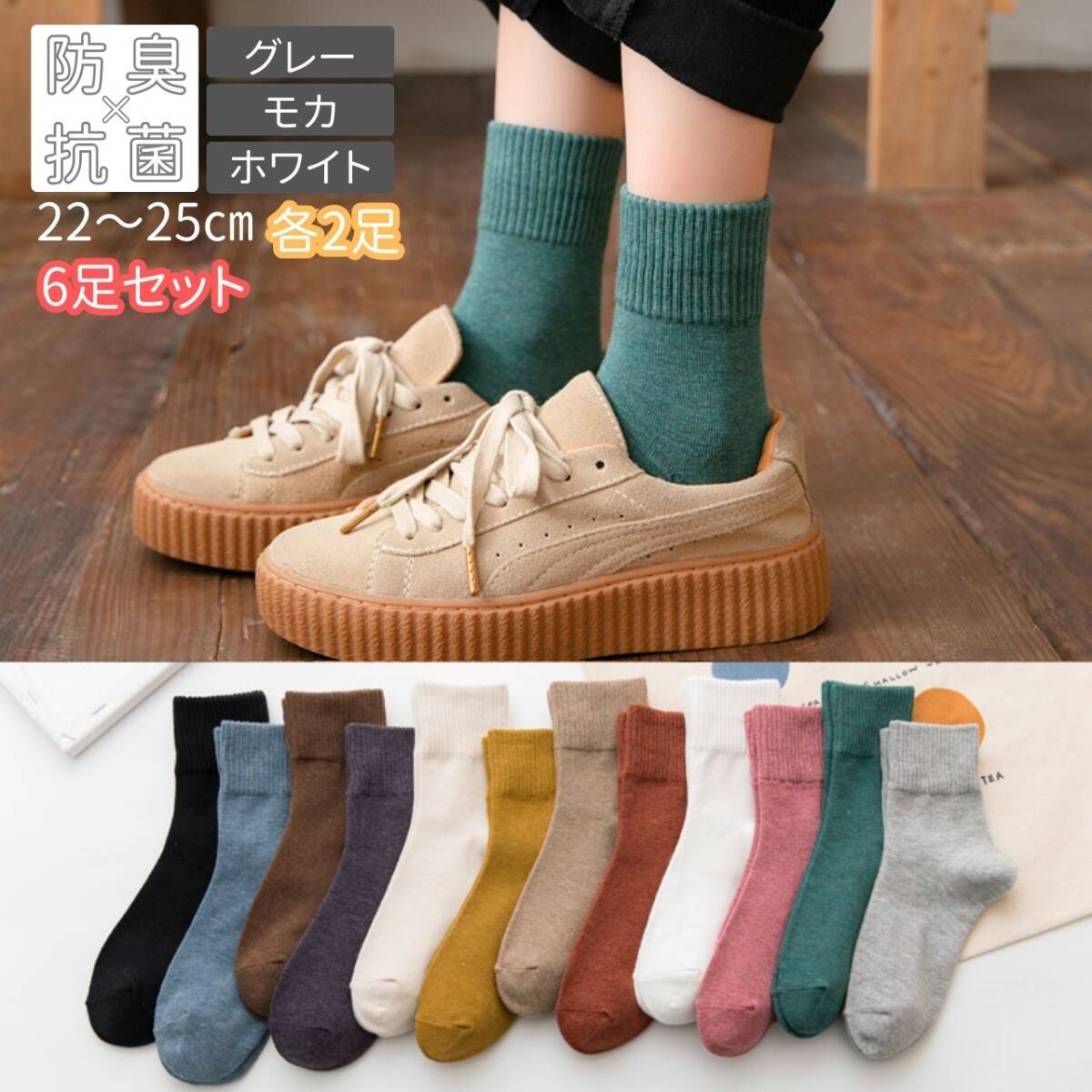靴下 6足組 蒸れない 抗菌防臭 ソックス レディース シンプル 灰白モカ各2枚