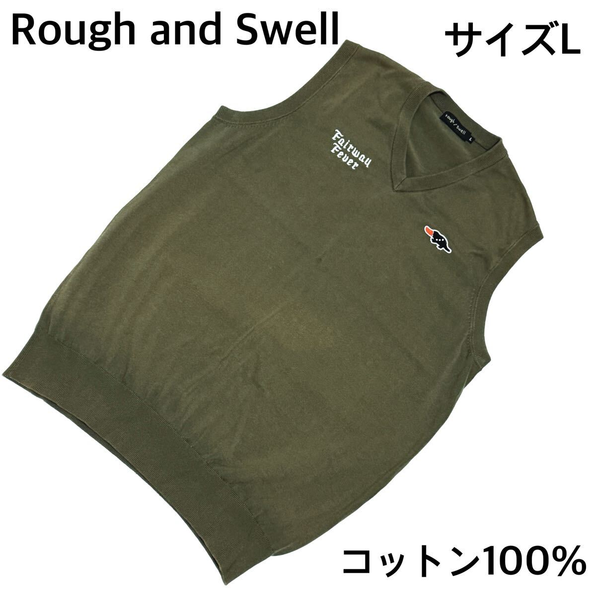 Rough and SwellのVネックベスト。フロントとバックに個性的な刺繍デザイン入り。コットン100%で軽やかな着心地◎カラーはオリーブグリーンで、ゴルフやカジュアルシーンに最適。大きなダメージなしで状態良好です。