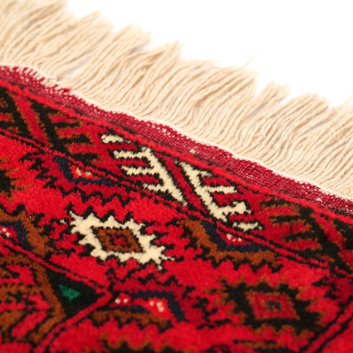 エルサリギュルが連続する構図により、トルクメン絨毯らしい格式と民族性を感じられる一枚。小型ながらも完成度が高く、飾り敷きや日常使いのラグとしても優れたバランスを備えています。