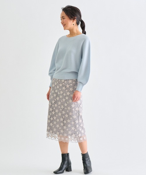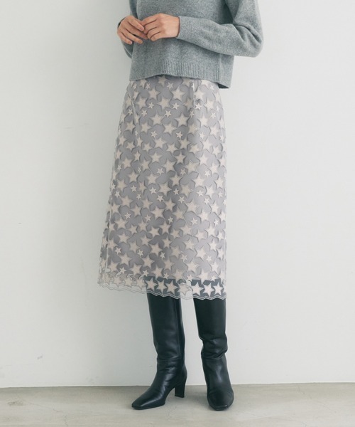 【Holiday Collection 2021】インポートのANAYIオリジナルのエンブロイダリーレースを使用しました。繊細なチュール地に刺繍された立体感と配色使いのスター柄は、ポップなモチーフですが優しい色合いなのでコーディネートに取り入れやすいのがポイント。シンプルなAラインシルエットに仕上げたスカートです。後ろのメタルファスナーと引き手のグログランリボンがポイント。ウエストベルトのないミニマルで美しいデザインです。合わせるカラーを選ばないグレージュカラーは、ブラウスやニットなど、様々なアイテムと相性抜群です。・裏地付き・後ろファスナー開き【