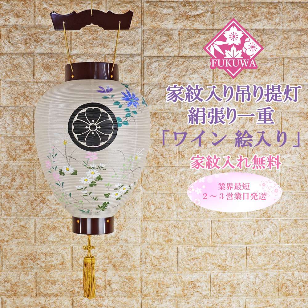 盆提灯 led 家紋入り 提灯 お迎え提灯 (プラ ワイン 絵入り紋天123) お盆 提灯 絹二重白 吊り led 壷型 家紋提灯 家紋