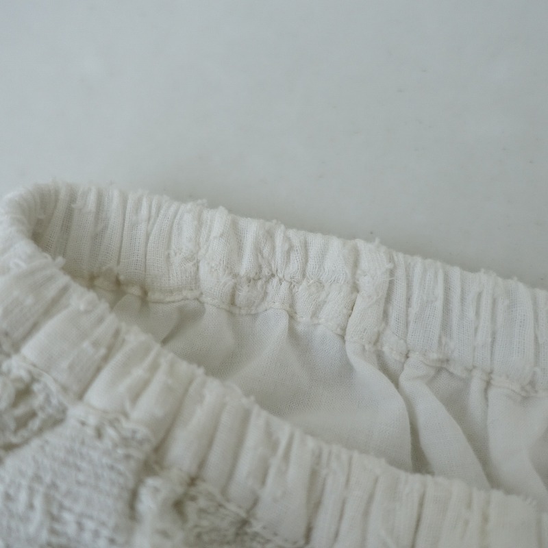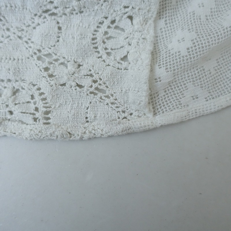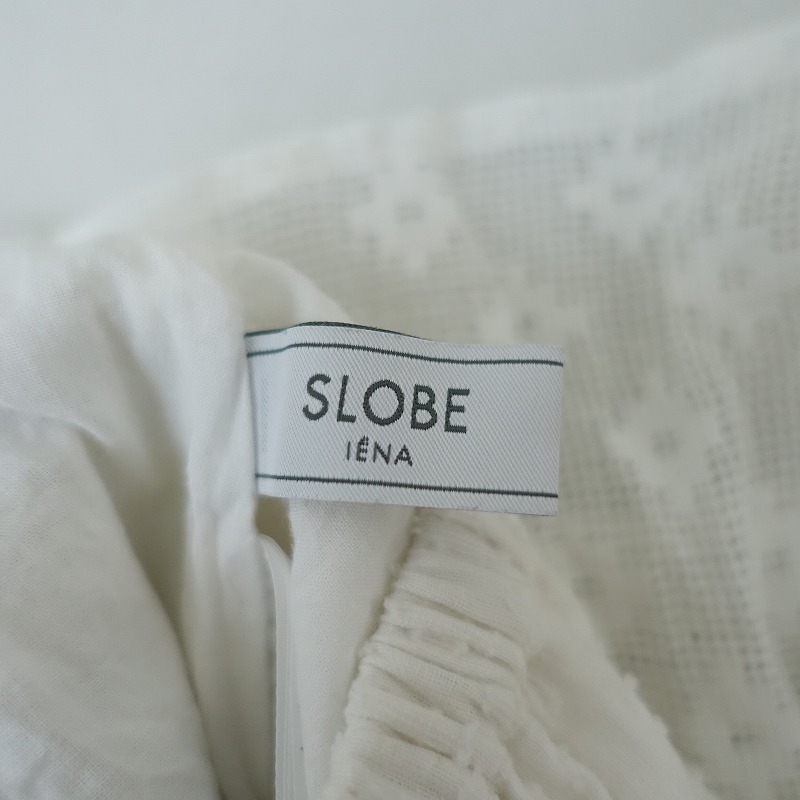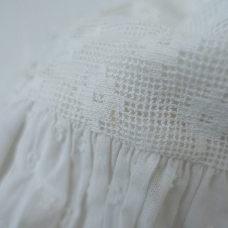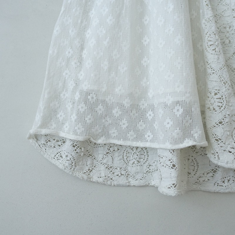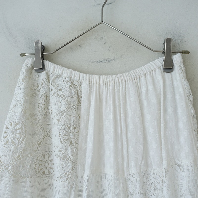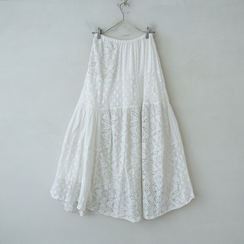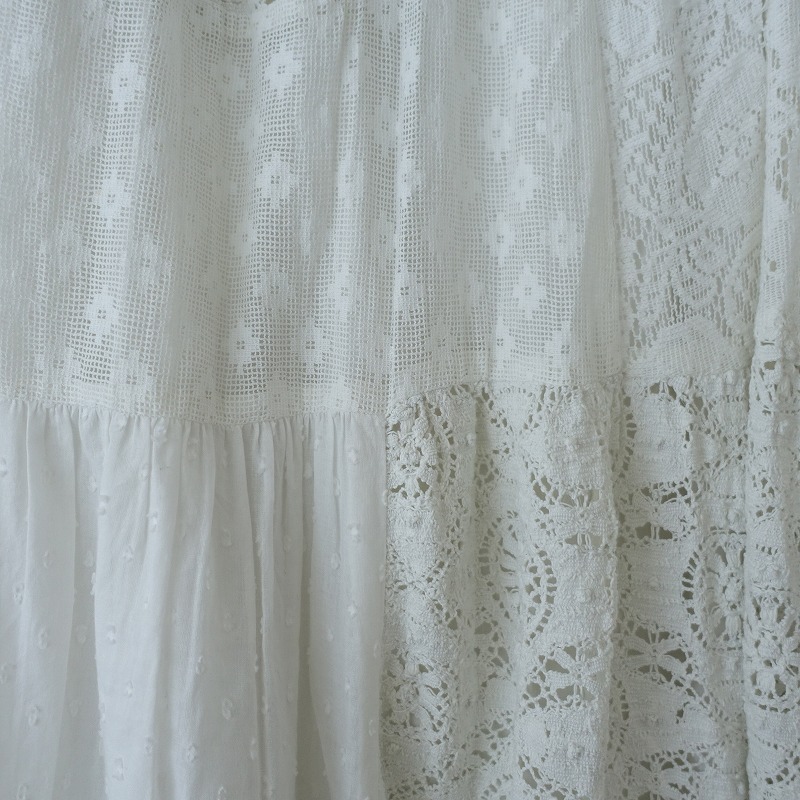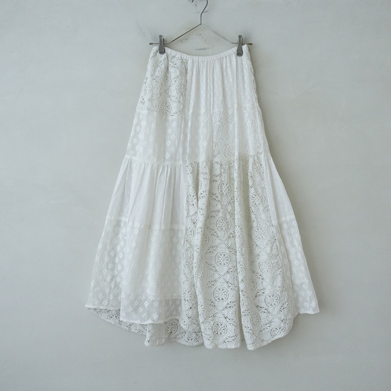 | SLOBE IENAのパッチワークレーススカートです。カラーはオフホワイトで、様々なレース地×様々な薄手カットジャガード柄地のパッチワークです。切り替え部分の所々にギャザーが施されており、ウエスト総ゴム入りです。裏地付きで、ポケットは付いておりません。こちらはインド綿を使用したインド製の商品です。 |