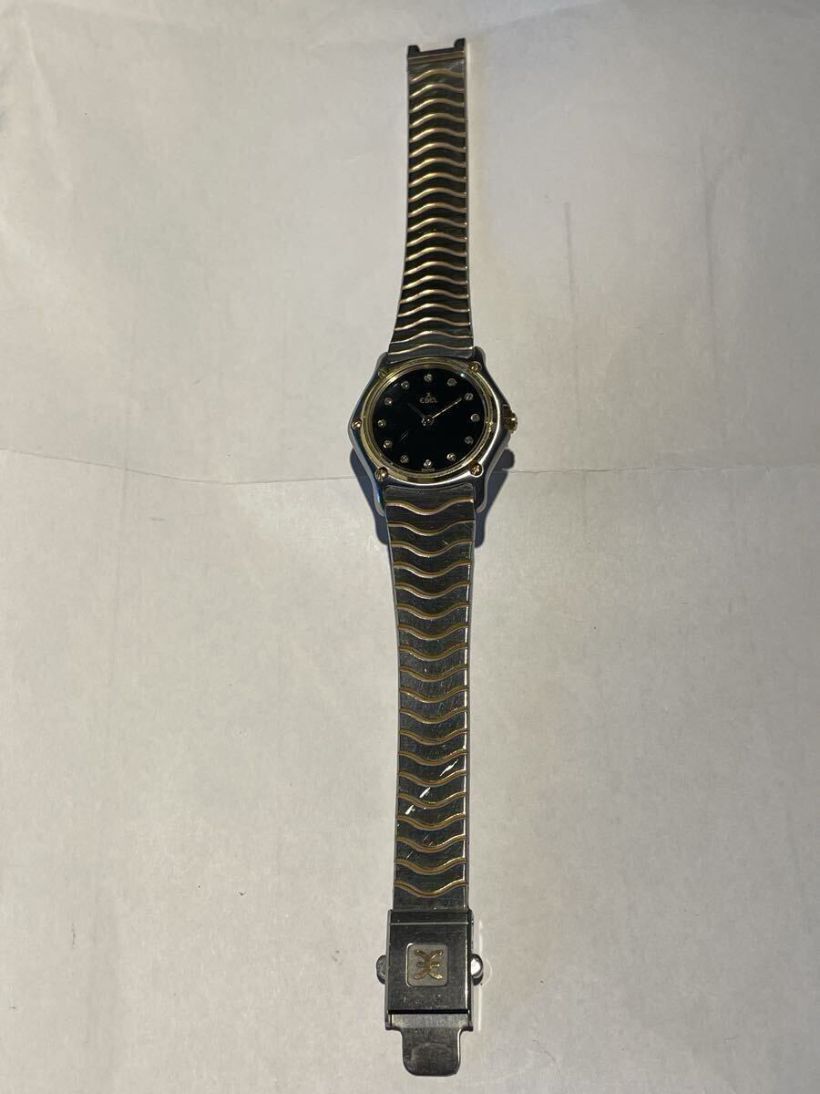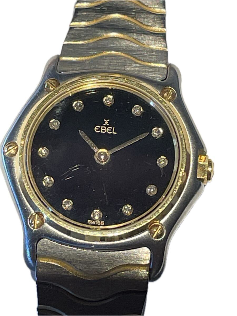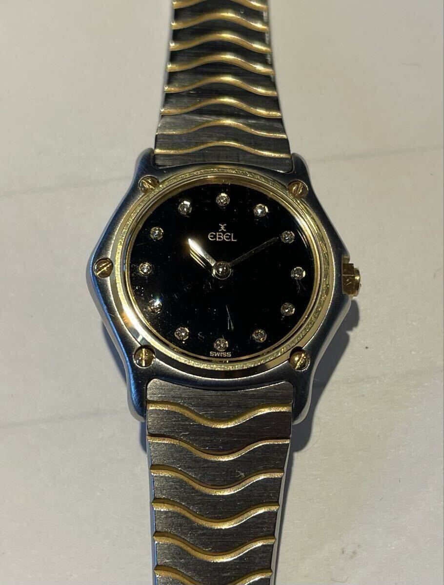 商品に興味をもっていただき、ありがとうございます。お読みいただき、入札をお待ちしています。EBEL エベル12石付き黒文字盤 使用に伴う細かい傷があります、現状は電池切れだとおもいます、腕周り14.5cm素人採寸、現状は不動です。ノークレーム、ノーリターンで写真をよく見てご判断を、宜しくお願いします。