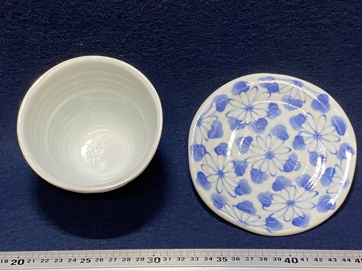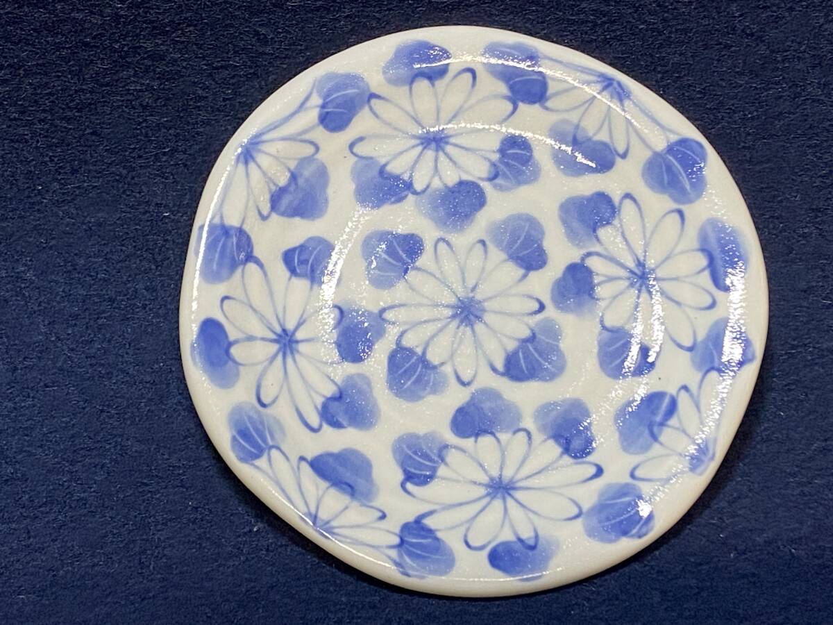 軽く指で弾くと堅焼きの高い音色がし、陶器で白磁に青絵の花柄の感じです。
