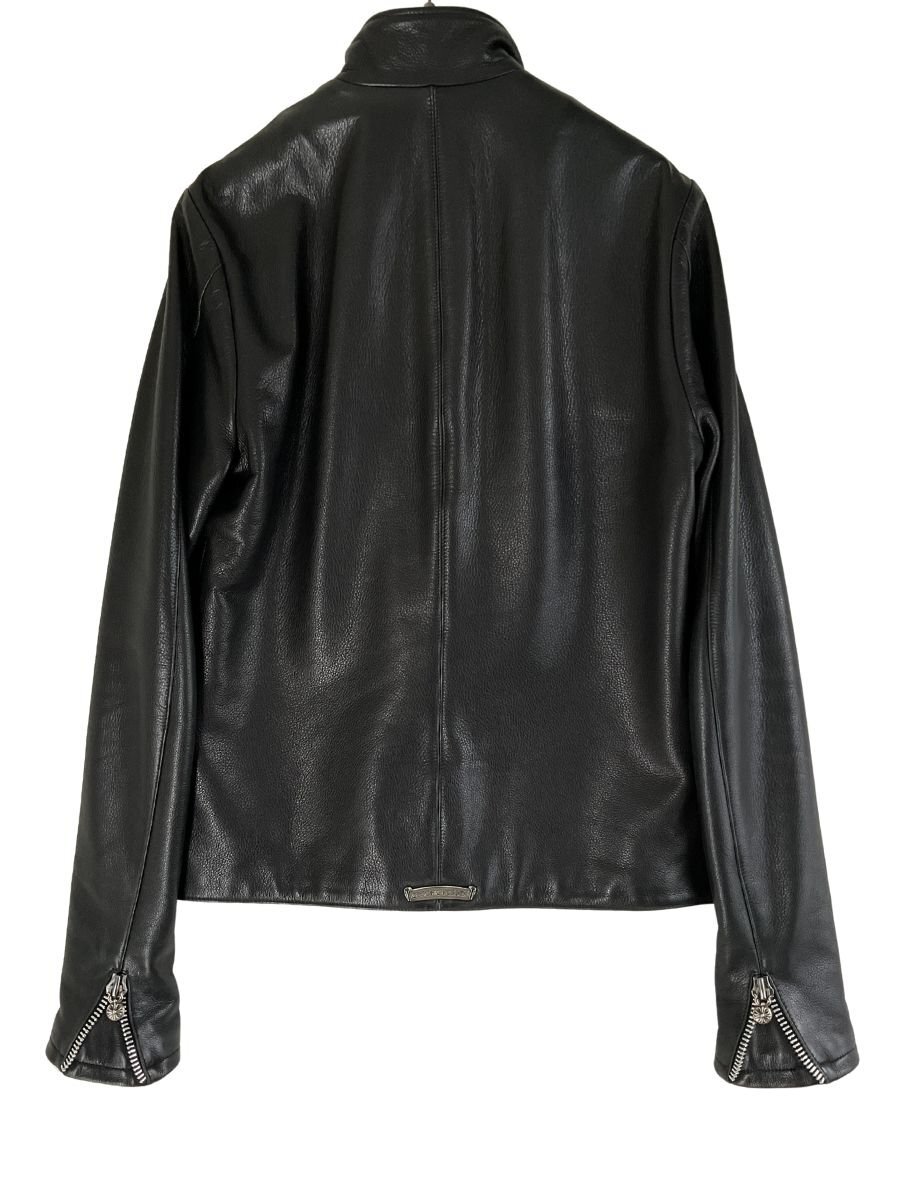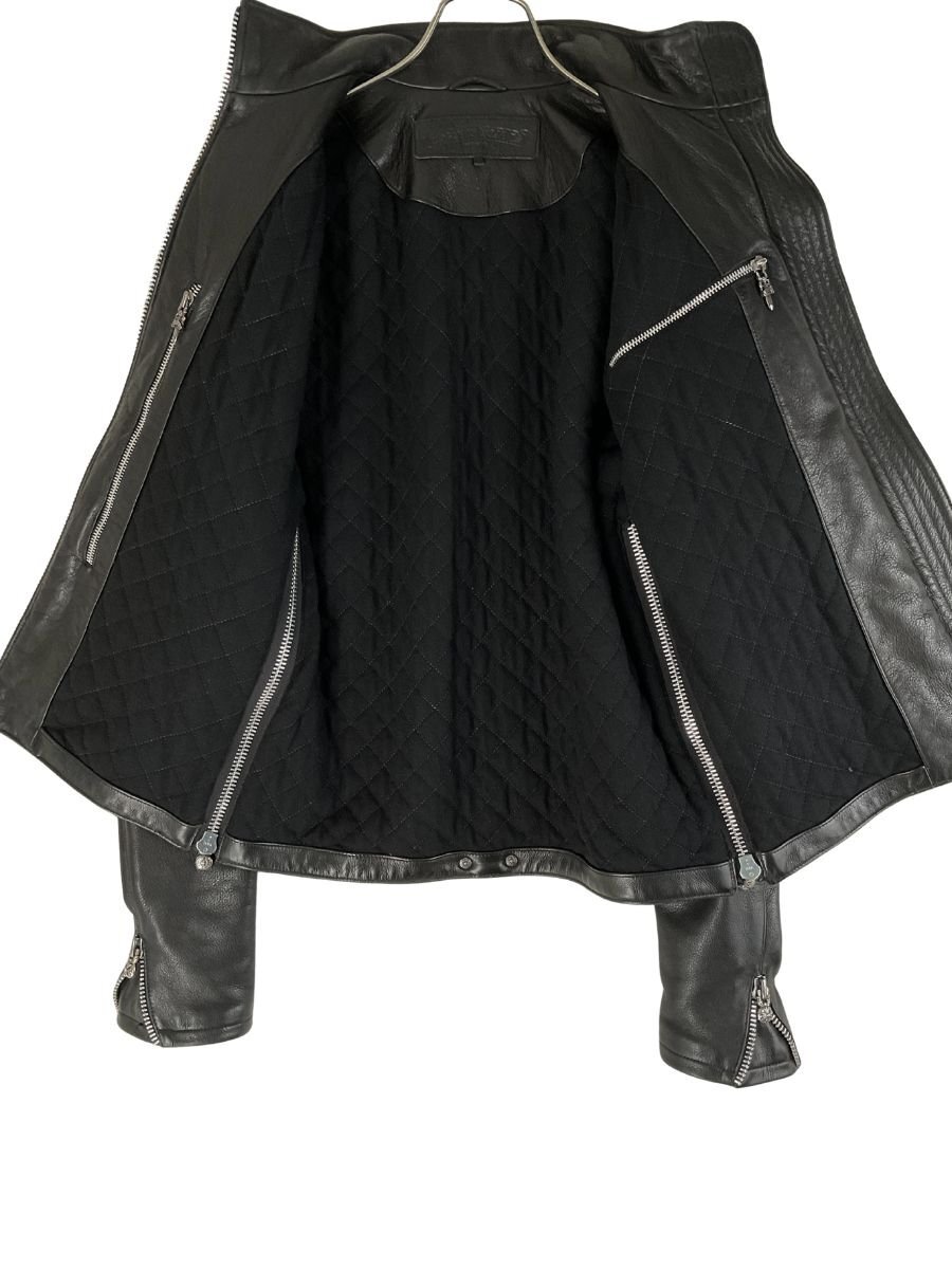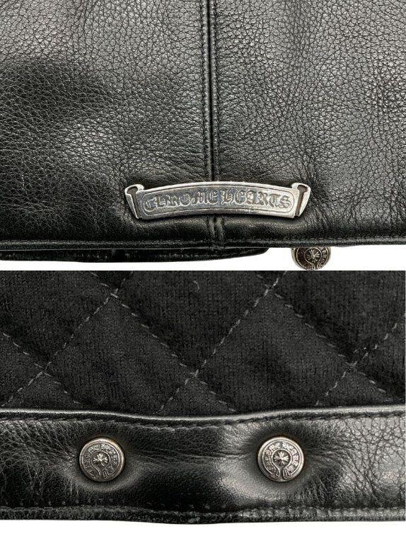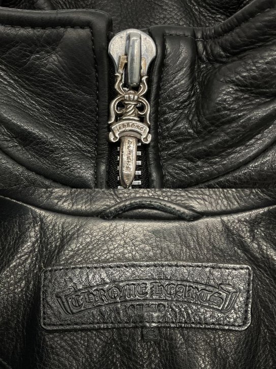 【紹介文】:CHROME HEARTS(クロムハーツ)による、極上の素材と緻密なディテールワークが魅力の「パーフェクトレザー」シリーズから、シングルライダースブルゾンが入荷しました。贅沢に使用された本革レザーと、無骨で洗練されたシルエットが、他にはない圧倒的な存在感を放つ一着です。フロントはダガー×クロスボタンによるダブルジップ仕様。サイドポケットにはダガージップ、アームジップにはクロスボタン付きジップが用いられ、ブランドの象徴が各所に刻まれています。さらに、内側にも左右にダガージップが配されており、裾のベント部分にはクロスボタン付きジップを採用。表からは見えにくい箇所にまでCHROME HEARTSならではの徹底したクラフトマンシップが息づいています。キルティング仕様の裏地により保温性も高く、デザイン性と実用性を両立。全体的に非常に良好なコンディションを保っており、レザー特有の経年変化を楽しみながら、これからも長くご愛用いただける一生モノのレザーブルゾンです。