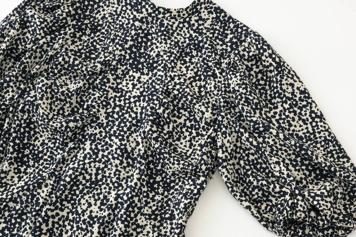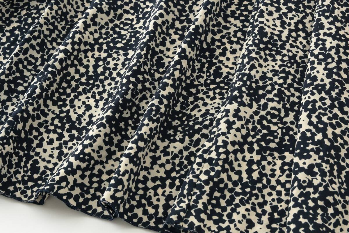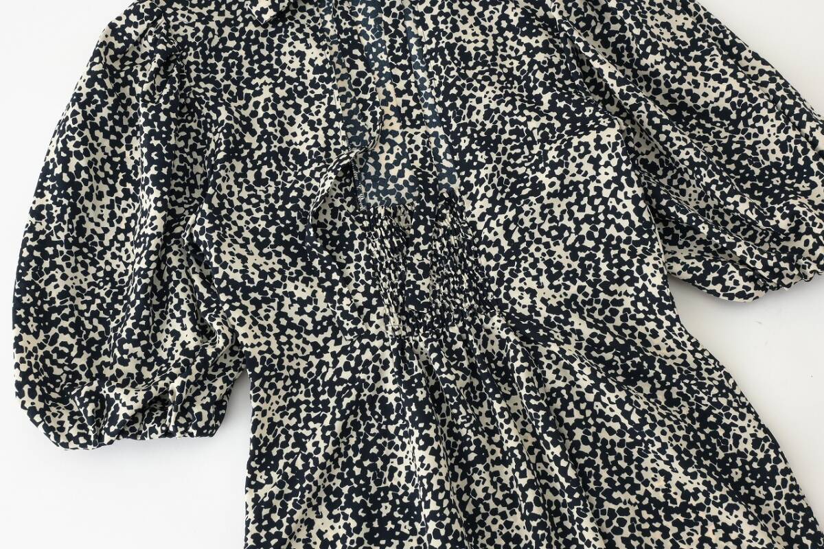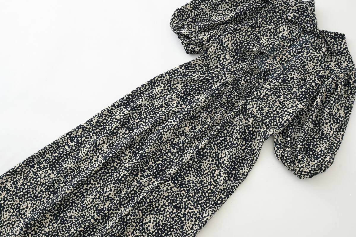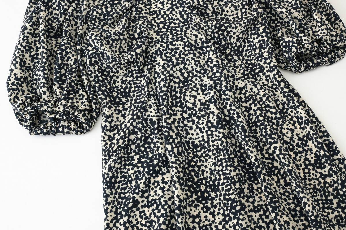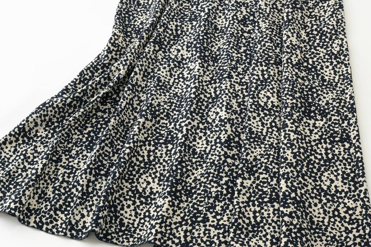 アイボリー×ダークネイビーのプリントが上品に映えるロングワンピース。