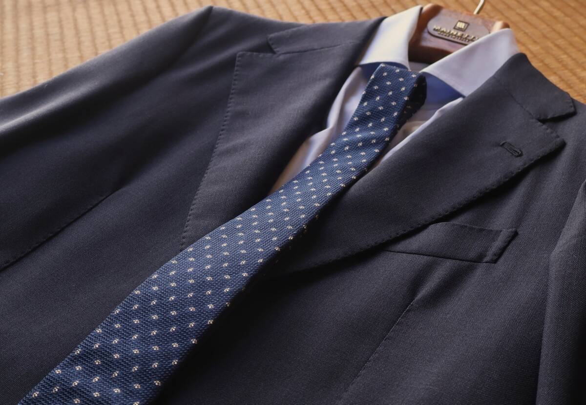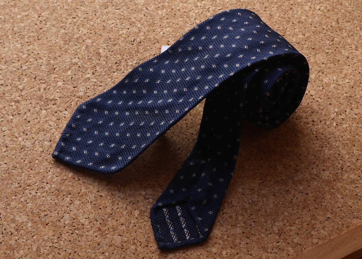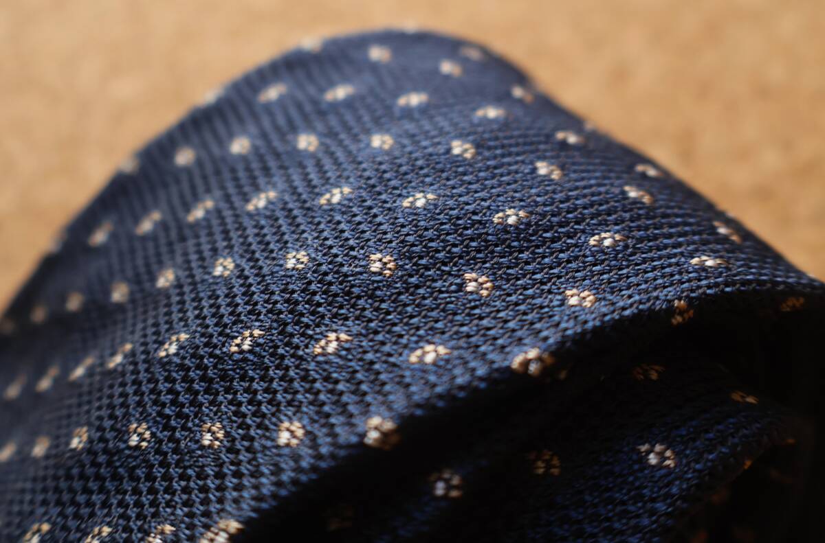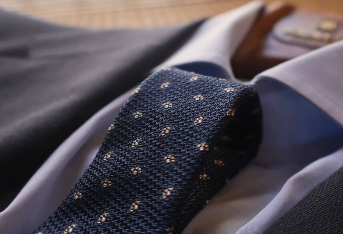 生地は、初代ジェームズ・ボンド(ショーン・コネリー)も好んだというグレナディン(ガルザ)です。グラナディンタイはTHE RAKEの「お洒落なネクタイの選び方」と言う記事で「ショーン・コネリーのジェームズ・ボンドは、英国でネイビーのグレナディン・タイを一般化した。そしてそれは今でも、フォーマルなオケージョンにおいて、非の打ち所のないチョイスである」と紹介されています。