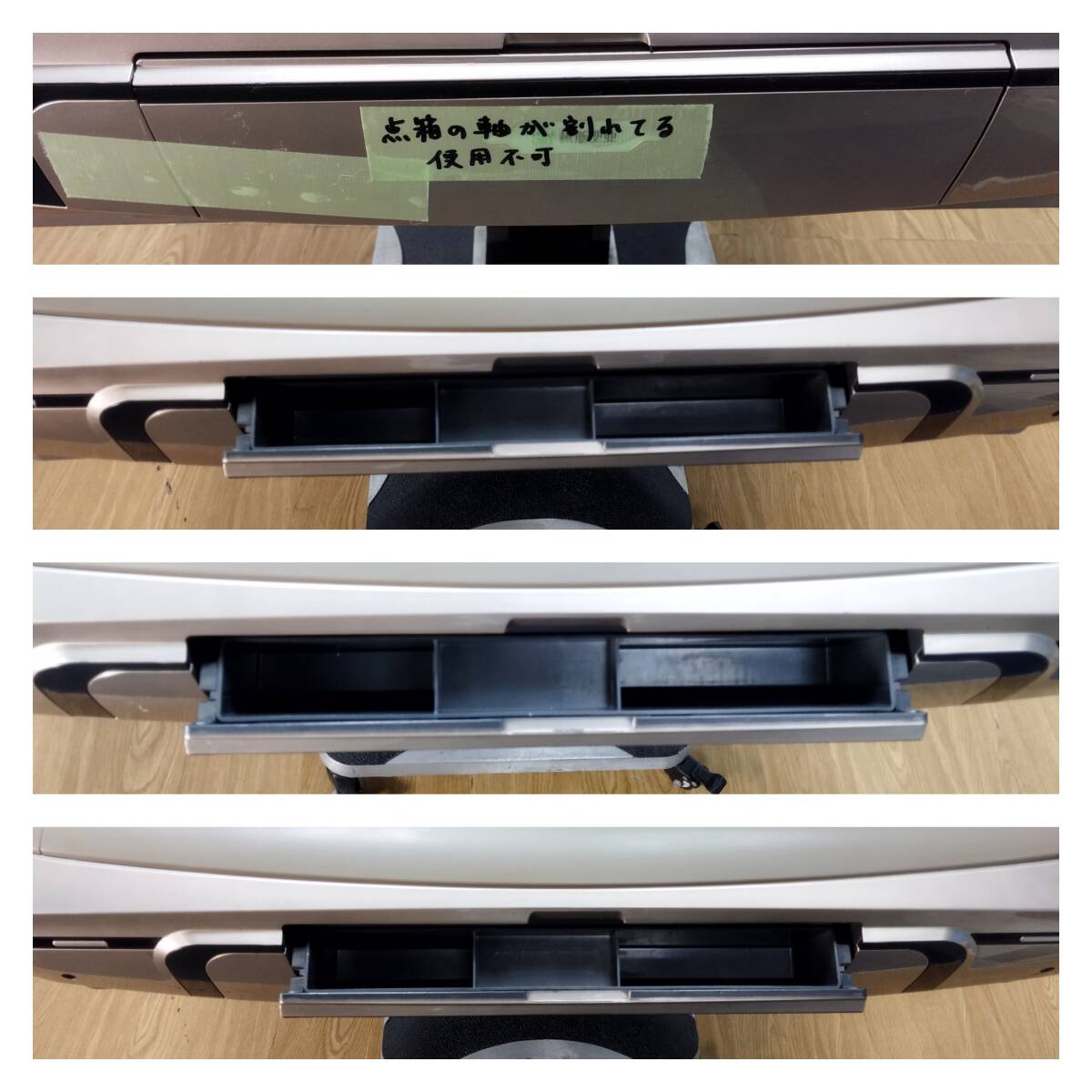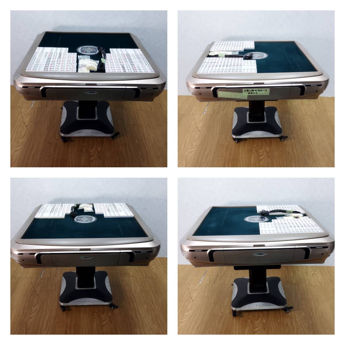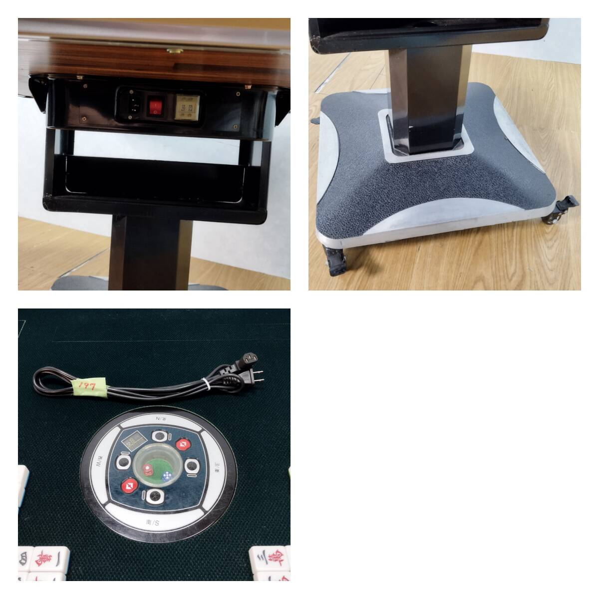 中古品になります。 ※台枠にダメージがあります。テープで補修している箇所があります。 ※点箱の軸が破損しているため、1箇所使用できません。 動作確認済み。 簡易清掃済み。 使用に伴う汚れや傷などあります。 お写真にてご確認ください。 あくまでも中古品になりますので、ご理解の上ご購入下さい。 付属品:電源ケーブル・起家マーク・ 点棒(1万点棒×8本・5千点棒×14本・千点棒×40本・百点棒×70本) ※赤牌はピンズの[5]に各2枚・マンズとソーズの[5]に各1枚ずつ ※花牌は付属しません。 ※付属品は写真の物が全てです。 ■商品詳細 寸法(素人採寸):W98cm×D98cm×H75cm 製造年:不明 ※記載の運搬サイズは梱包予定サイズとなっております。 梱包状態によりサイズや個数の変更が御座いますが、サイズ変更に伴うご返金や徴収は致しませんのでご了承の上、ご入札下さい。 商品の返品および交換は承っておりません。 ただし、商品の欠陥や不良など当方原因による場合には返品をお受けします。 商品到着後一週間以内にご連絡ください。 新規の方、悪いの評価の多い方の入札はお断りいたします。 原則として、ご入金は5日以内でお願い致します。お客様のご都合により遅れる場合は事前にご連絡の方宜しくお願い致します。 落札後5日を過ぎてもご連絡が無い場合はお客様都合でのキャンセル扱いとさせて頂きますのでご了承下さい。 ※直接引き取り、自社配送でのお渡しとなります。 直接引取の場合、さいたま市見沼区の当方指定の倉庫でのお渡しとなります。 最寄り駅は東大宮駅となります。 自社配送可能エリア、金額等は、写真にてご確認ください。 自社配送の場合は作業員一名でのお伺いの為、トラックの荷台でのお渡しとなります。 197YHS202574 | |||