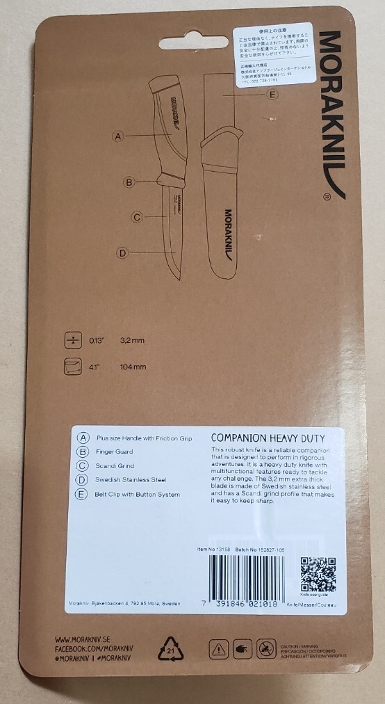 「コンパニオン ヘビーデューティー」 状態確認のために開封しましたが “未使用品” です 【状 態】 ・開封済未使用品 【スペック】 ・カラー:ブラック ・サイズ:刃厚3.2mm、刃長10.4cm 全長22.4cm ・重 量:104g ・素 材:ステンレス、TPEラバー ・生産国:スウェーデン 【発送方法】 ・宅急便コンパクト(ヤマト運輸) 〔匿名、追跡、補償あり〕 |