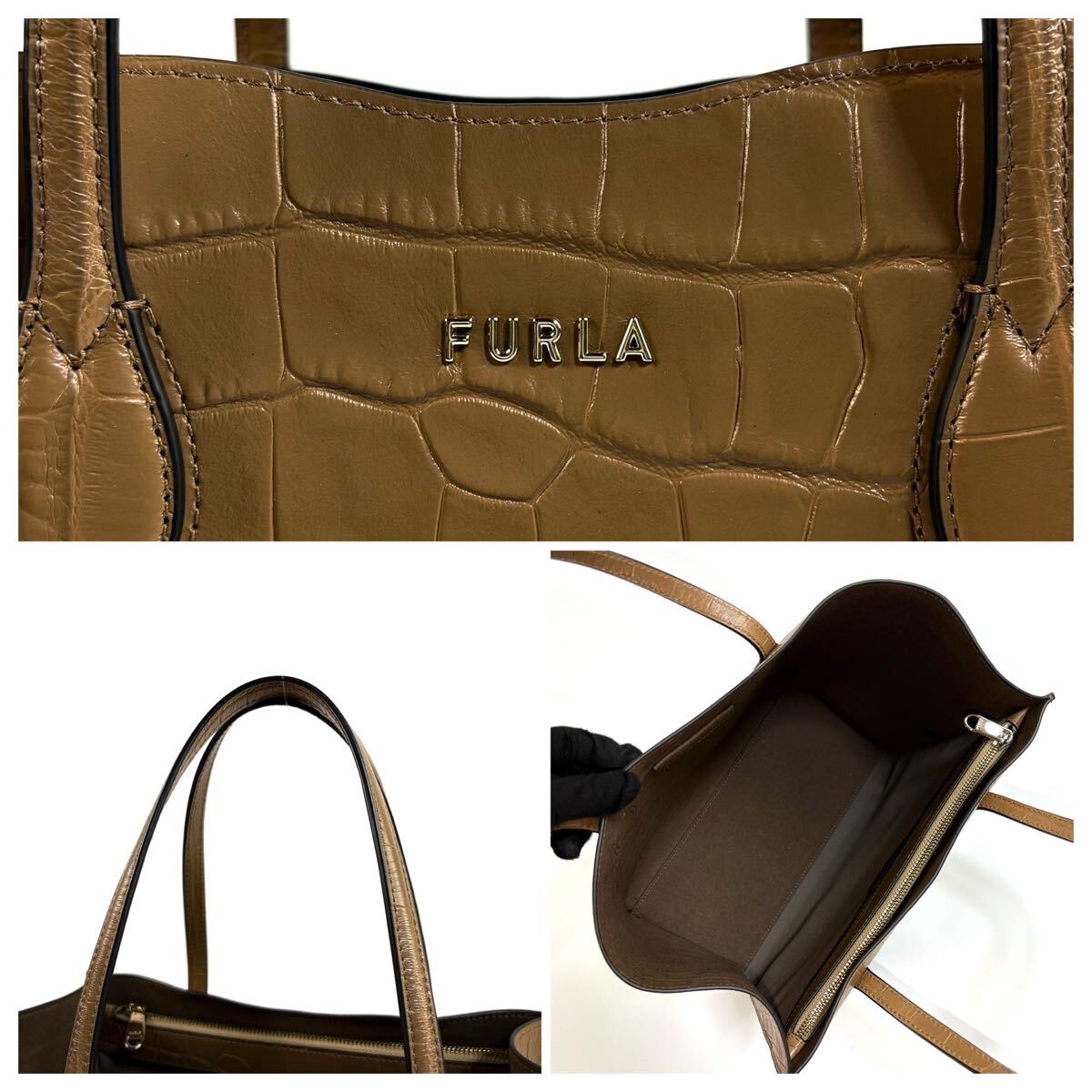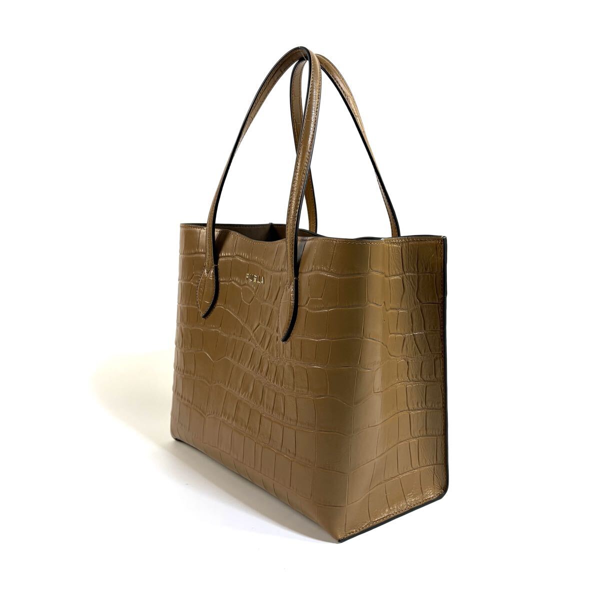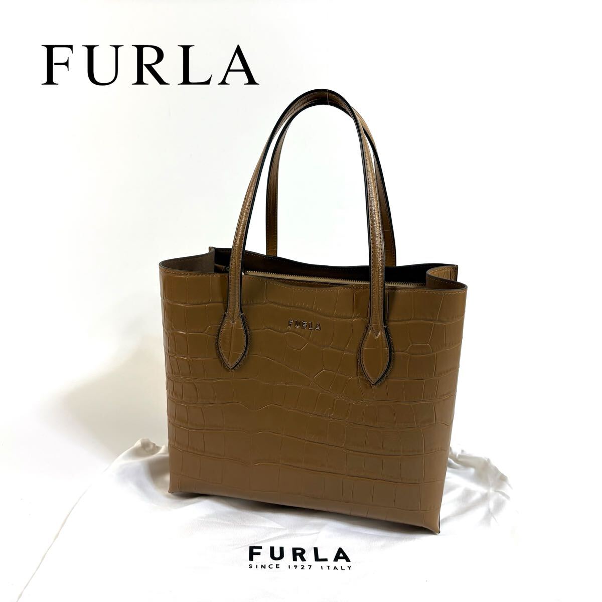 【極美品】FURLA フルラ レザー ハンドバッグ トートバッグ クロコ型押し ブラウン キャメル 保存袋付き |