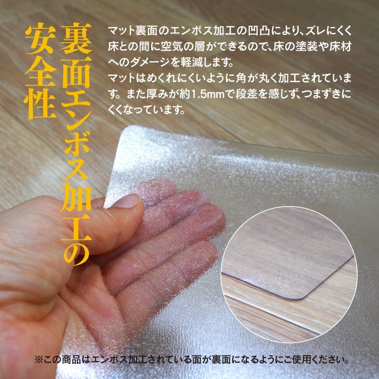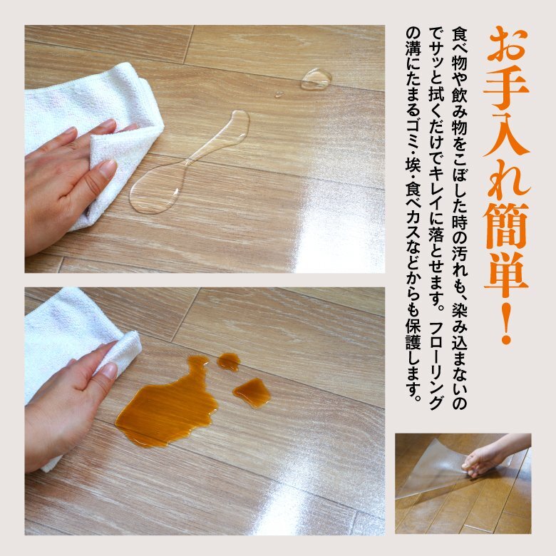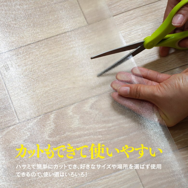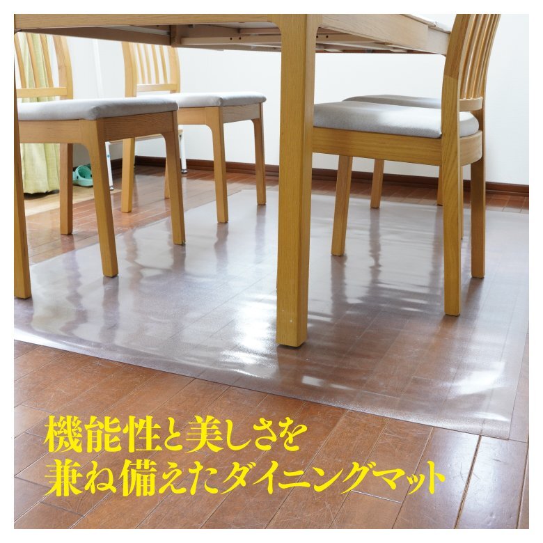 機能性と美しさを兼ね備えたダイニングマット 汚れやキズから床を保護! イスやテーブルを引きずる時のキズ、物を落とした時のキズやヘコミ、子供のおもちゃ遊びなどからフローリングを保護します。 お手入れ簡単! 食べ物や飲み物をこぼした時の汚れも、染み込まないのでサッと拭くだけでキレイに落とせます。フローリングの溝にたまるゴミ・埃・食べカスなどからも保護します。 裏面エンボス加工の安全性 マット裏面のエンボス加工の凹凸により、ズレにくく床との間に空気の層ができるので、床の塗装や床材へのダメージを軽減します。 マットの角は丸く加工されていてめくれにくくなっています。また厚みが約1.5mmで、段差も感じずつまずきにくくなっています。 ※この商品はエンボス加工されている面が裏面になるようにご使用ください。 床暖房設定に対応の耐熱性 耐熱試験をクリア。一般的な25℃~30℃の床暖房設定に対応しています。寒い日でも足元はぽかぽかで快適です。 カットもできて使いやすい ハサミで簡単にカットでき、好きなサイズや場所を選ばず使用できるので、使い道はいろいろ! ■仕様 材質:軟質PVC 使用温度:約-10℃~+50℃ 厚さ:約1.5mm 表面加工(裏面):エンボス加工 サイズ:4種類 180cm×300cm 180cm×240cm 180cm×180cm。 140cm×190cm←こちらのサイズになります。 ■セット内容 ダイニングマット本体(140cm×190cm)×1 ■ご注意 ※この商品は輸入品です。輸入時における、包装材に痛みがある場合があります。あらかじめご了承ください。 ※サイズは、多少の誤差が生じる場合があります。あらかじめご了承ください。 ※モニター環境により、実際のものと素材感・色が多少異なって見える場合がありますので、あらかじめご了承ください。 ※床暖房の上にも使用できますが、塗料ワックスによっては対応できないことがあります。 ※本製品を長時間敷いたままにしておいたり、床面に、ワックス、薬品、水などが付着していると、素材の塩化ビニルなどが化学変化により床材に密着や変色を起こす場合があります。 ※月に一度はマットを持ち上げ、乾拭きをして湿気などを取り除いてください。 ※日常のお手入れは、水や中性洗剤で汚れを拭き取り、その後、乾拭きをして水分を取り除いてください。水分を残しておくとスリップすることがあります。 ※シンナーやベンジンなどは使用しないでください。表面が変色、変形することがあります。 ※湿度や温度の変化により、多少収縮することがあります。 ※マットの上に直接熱いものを置かないでください。表面が変色・変形することがあります。 ※仕様・デザインは改良のため予告なく変更することがあります。 ※商品は、折り目がつかないよう基本的に丸巻きの状態で発送します。 ※同梱品などにより梱包仕様が異なることがあります。 ※丸巻きで保管し発送しているため、しばらくは丸巻きのクセや波を打ったような感じが残りますが、時間がたつと平らになります。 |