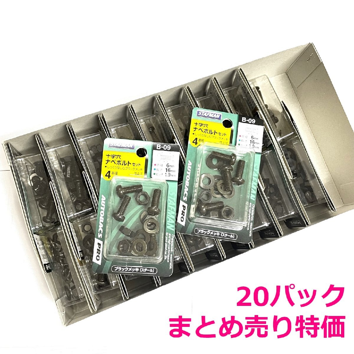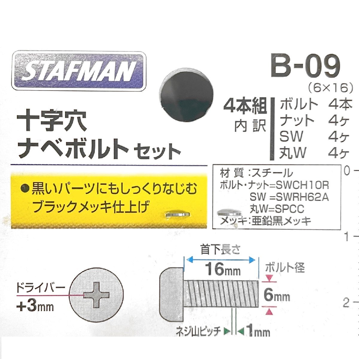 | 商品説明 | ■メーカー : STAFMAN スタッフマン ■商品名 : 十字穴 ナベボルトセット 4本組×20パックまとめ売り ■型 番 : B-09-SET20 ■定 価 : ■状 態 : 新品 パッケージに販売店シールあり ※バーコードシールは貼ったままで発送します。ご了承ください。 ----------------------------------------------------------- 十字穴ナベボルトセット 4本組×20パックセット まとめ売り特価 しっくりなじむブラックメッキ仕上げ 直径:6mm 長さ:16mm ピッチ:1.0mm ボルト4本/ナット4個/SW4個/丸W4個 材質:スチール ドライバー +3対応 日本製 |