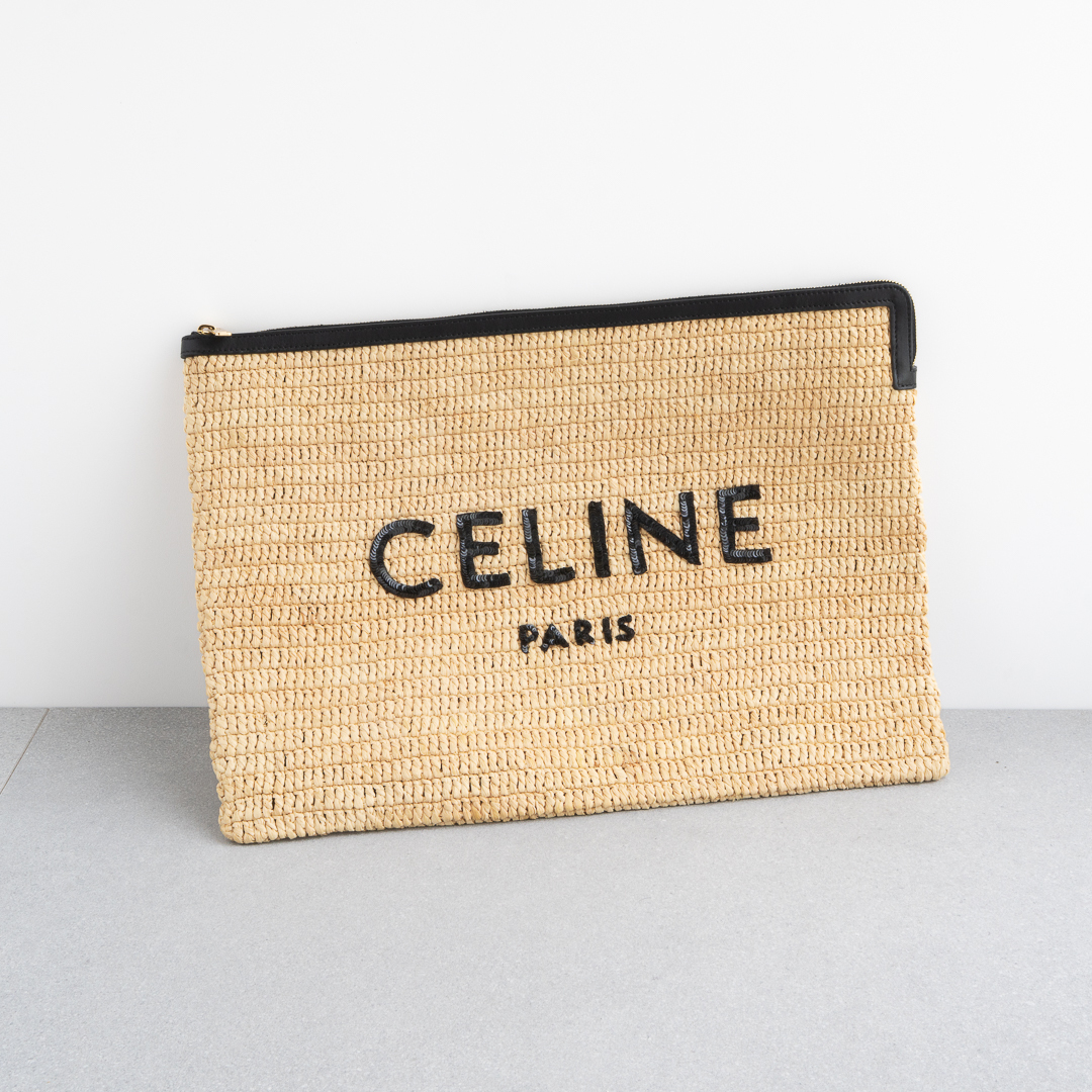ナチュラルなラフィア素材に、モダンなブラックのCELINEロゴをあしらったデザイン。ロゴ部分はスパンコール仕立てで、きらりと軽やかなアクセントを添えます。A4書類や11インチiPad、13インチノートパソコンも入るサイズ感で、クラッチとしてはもちろんポーチ使いもOK。デイリーにさらりと持てる、頼れるアイテムです。
