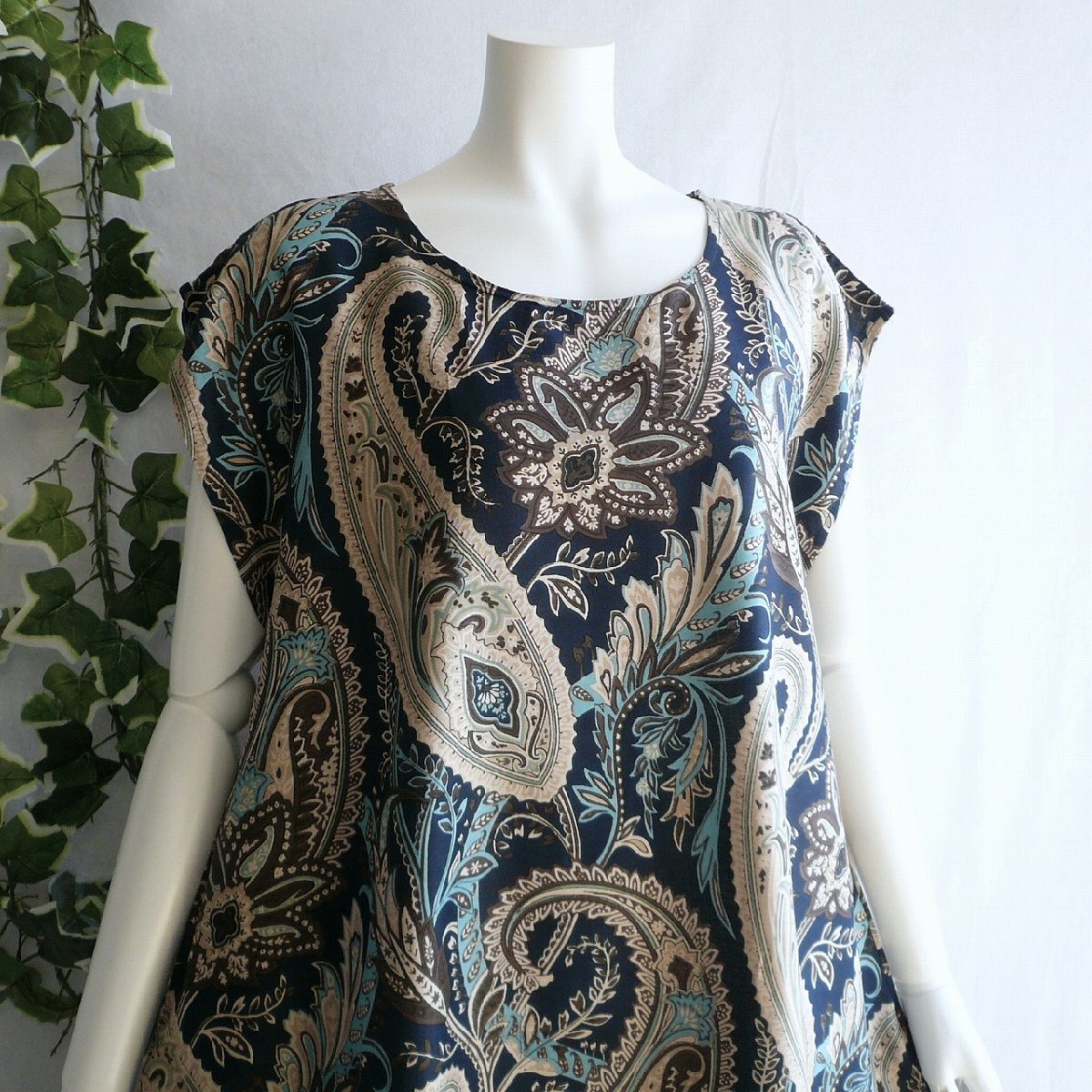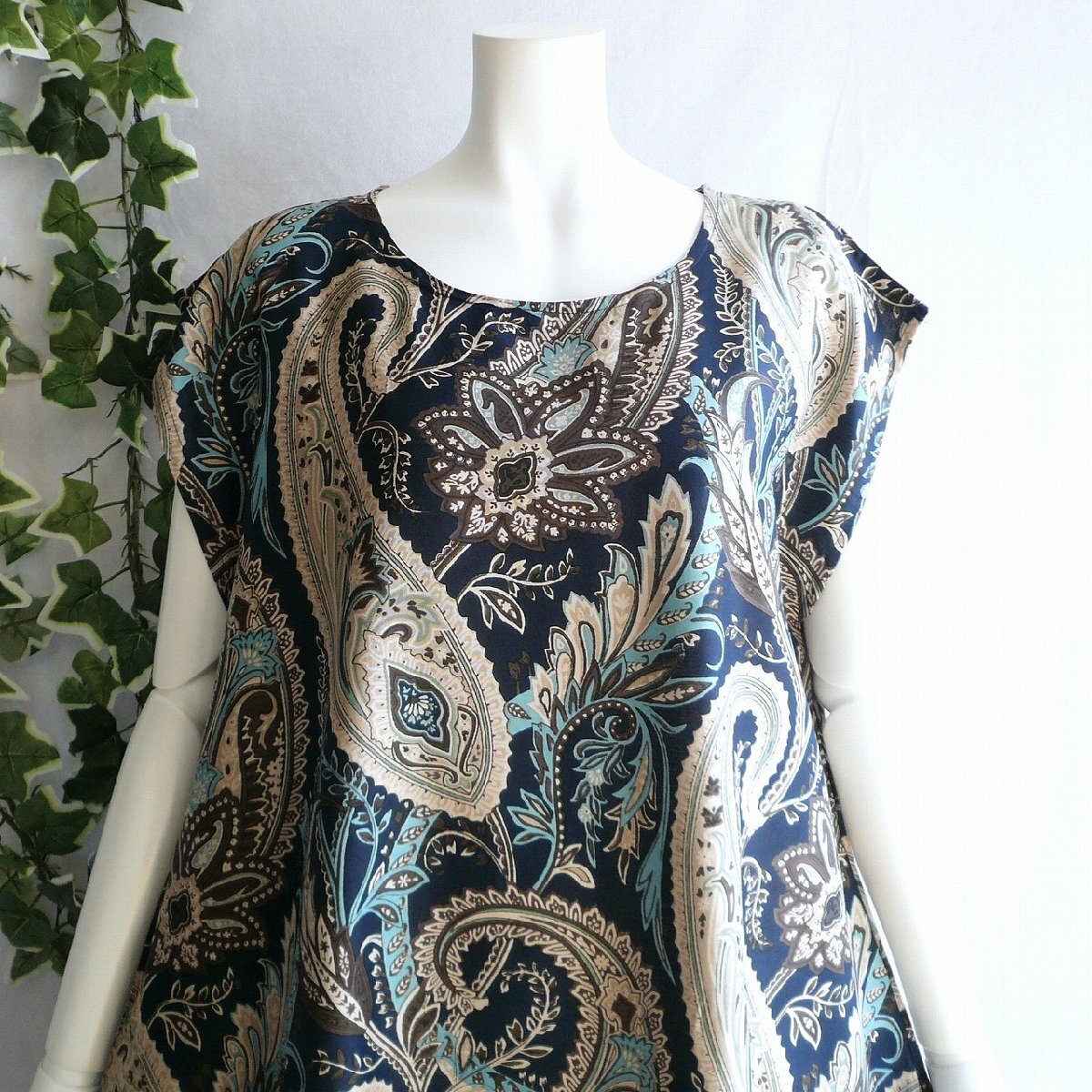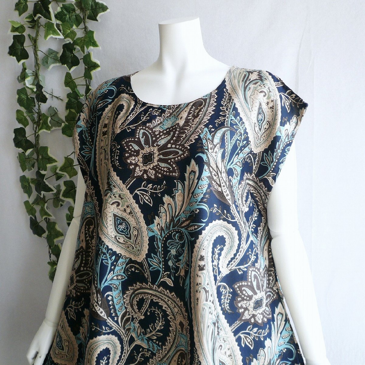 新品 9694 ML 大きなペイズリー柄 ワンピース 紺系 春 夏 レディース インド製 レーヨン100% フレンチ袖 透け感 50代 60代 70代