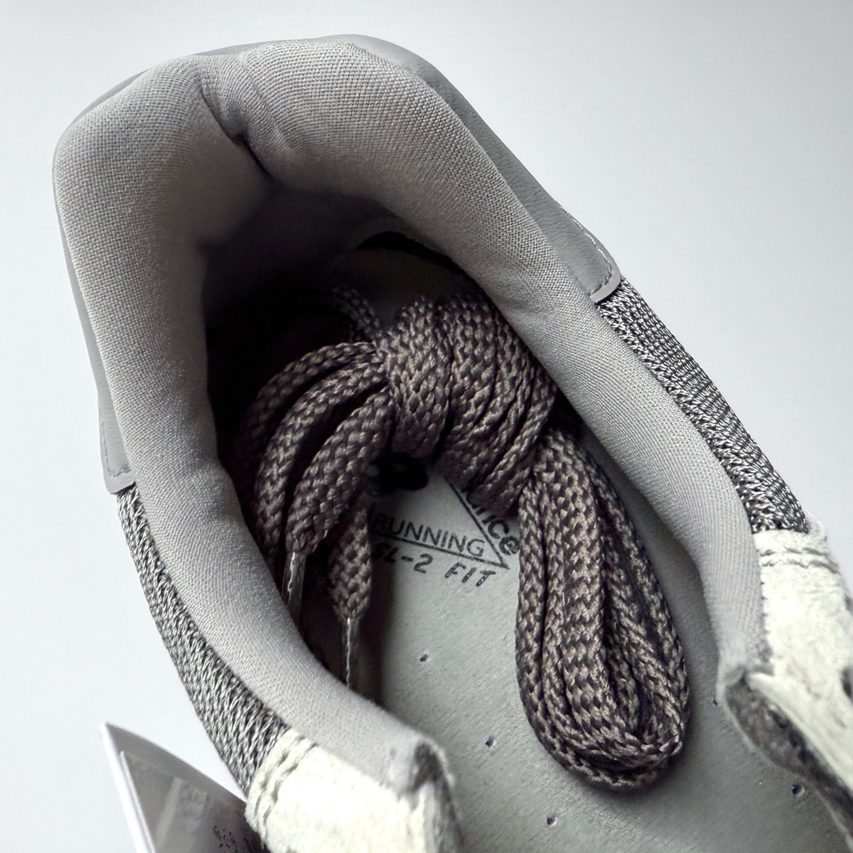 耐性を補強するダブルステッチ縫製、縦長のシュータン根本のスロートステイ、角張ったアウトソールトゥ。