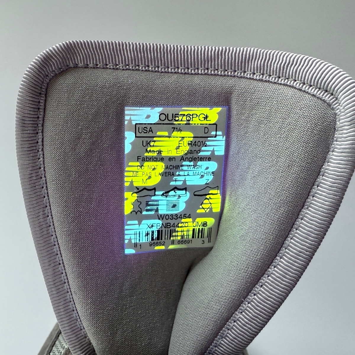 ベロタグの「576」のクラシックなフォントと細かく14本に刻んだNBロゴもオリジナルを克明に再現しています。