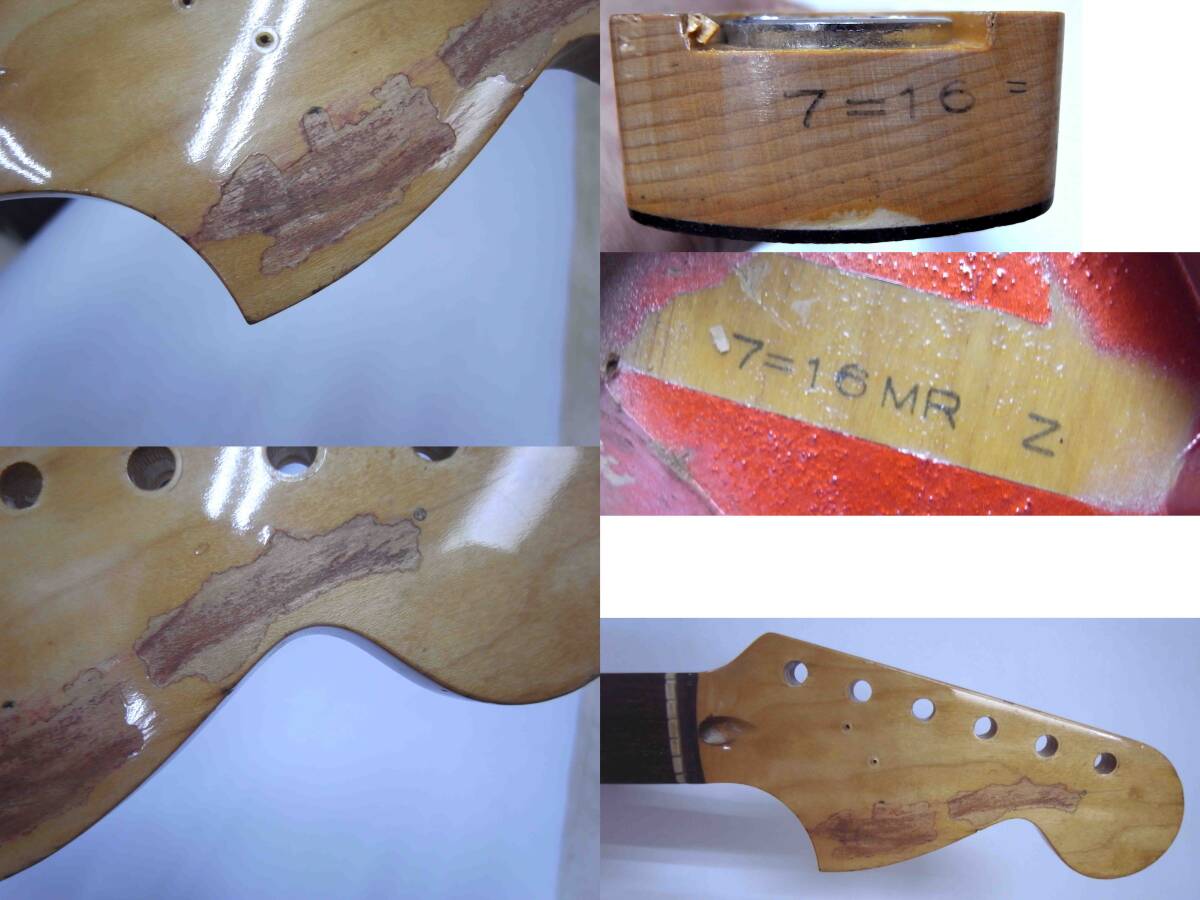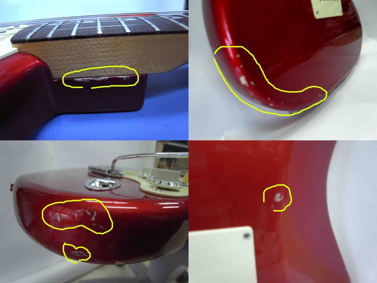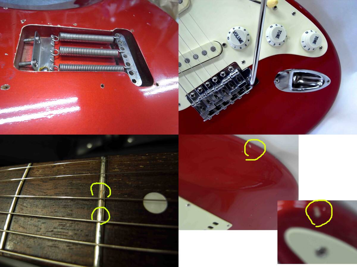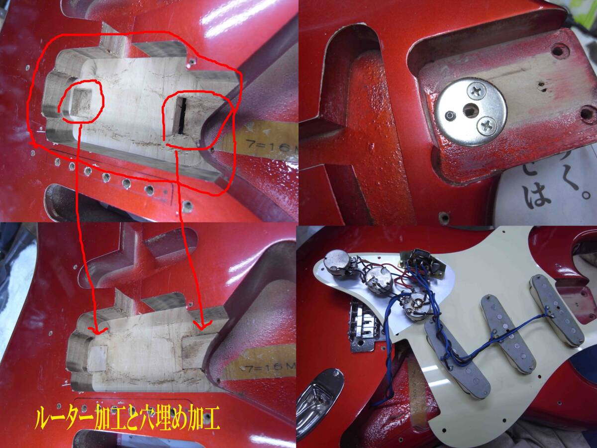 本品は入荷時、素人改造でリアがハンバッキングに変更・ポケットもノミ加工で状態がひどい穴掘りだった物を当方でルーター加工後(ブロック穴埋めも写真のようにして置きました)にクリアー塗装しています。